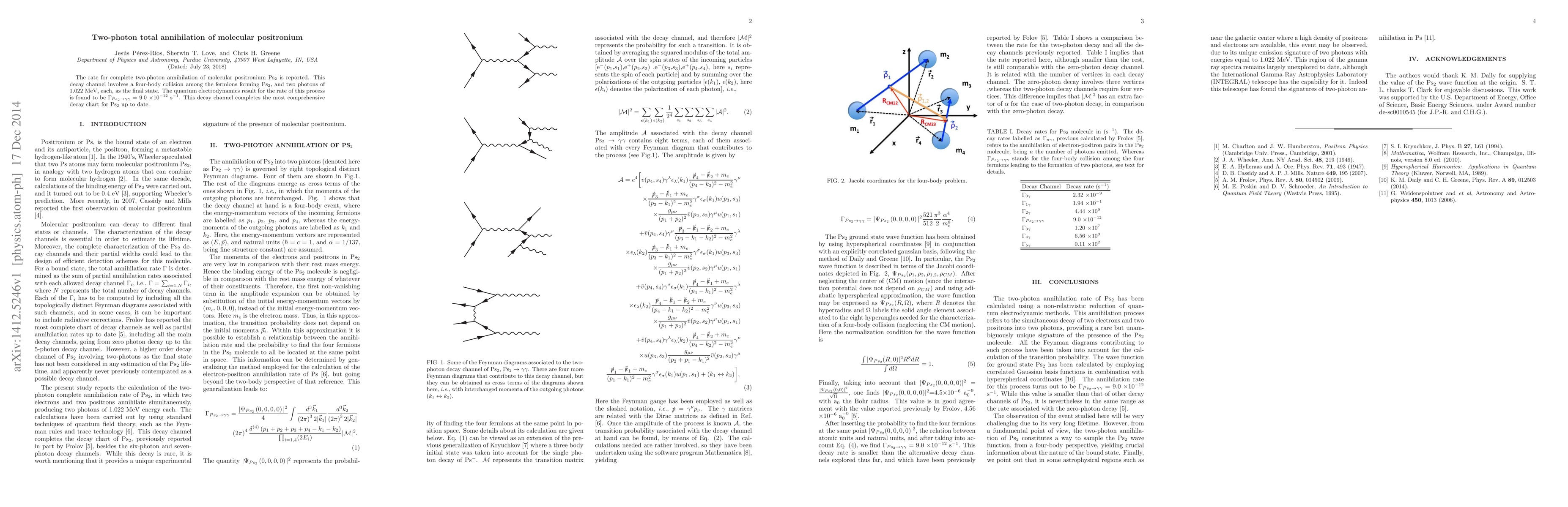 This paper reports the rate for the complete two-photon annihilation of molecular positronium (Ps$_{2}$), revealing a quantum electrodynamics result of $\Gamma_{Ps_{2} \rightarrow \gamma\gamma}$ = 9.0 $\times 10^{-12}$ s$^{-1}$. This decay channel completes the most comprehensive decay chart for Ps$_{2}$ to date.