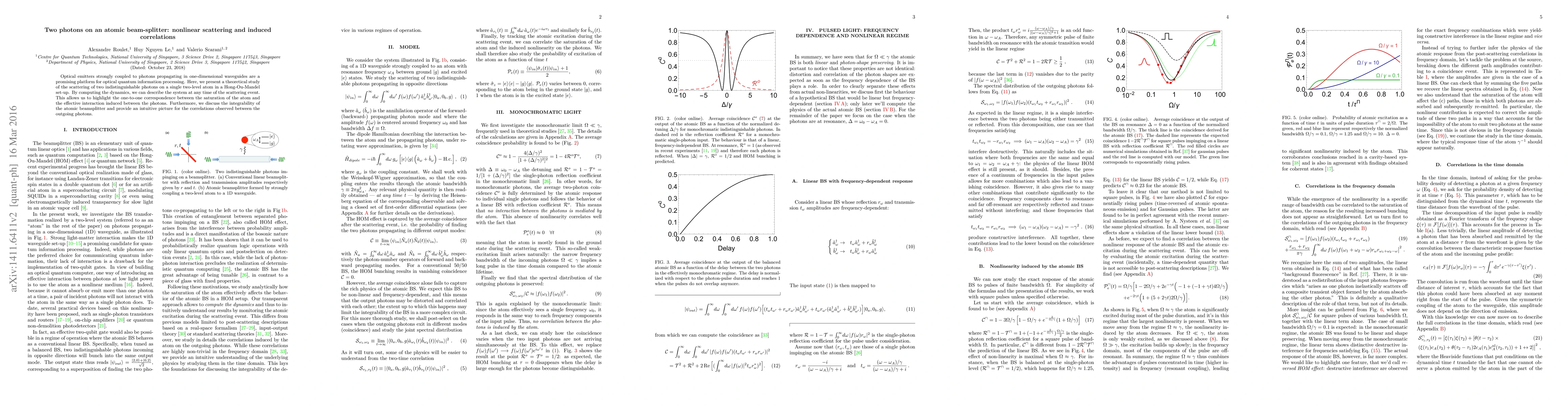 This paper theoretically investigates the nonlinear scattering of two photons on a single two-level atom in a Hong-Ou-Mandel setup, revealing the interaction induced between photons and the correlations observed in their outgoing states, alongside the atom's saturation dynamics. The study also explores the integrability of the atomic beamsplitter.