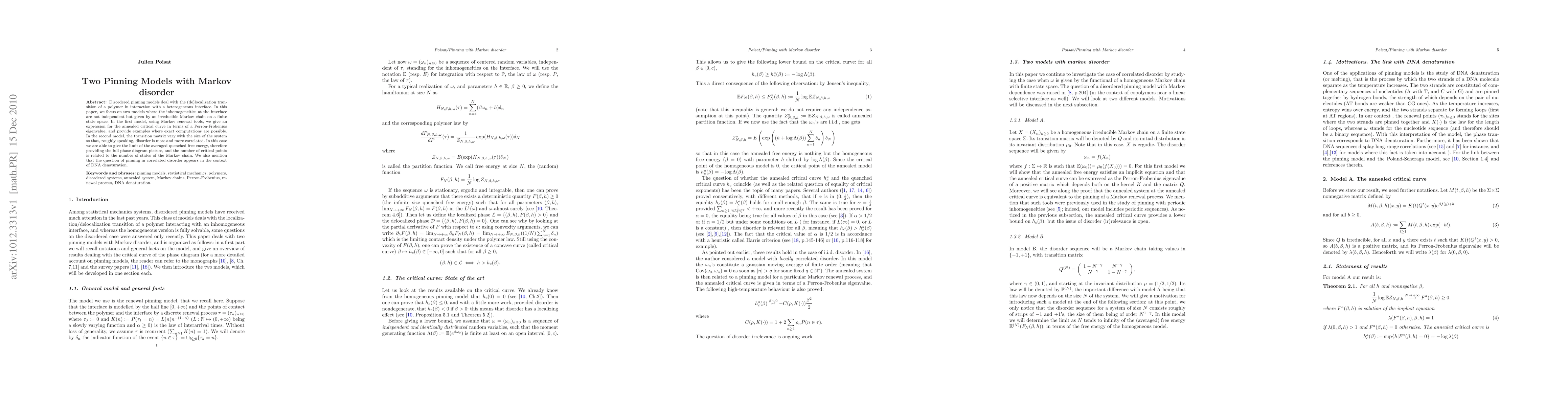 This paper explores two Markov disorder pinning models for polymers interacting with heterogeneous interfaces. The first model uses Markov renewal theory to determine the annealed critical curve via a Perron-Frobenius eigenvalue. The second model, with increasingly correlated disorder, provides the limit of the averaged quenched free energy, revealing the full phase diagram and linking critical points to the number of Markov chain states.