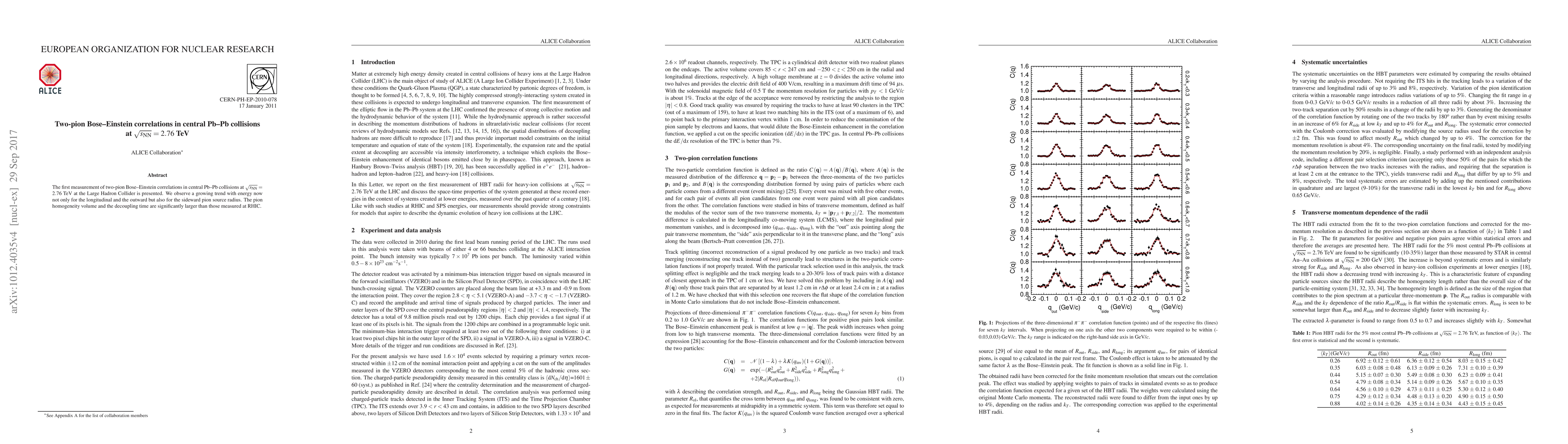 The first measurement of two-pion Bose-Einstein correlations in central Pb-Pb collisions at $\sqrt{s_{\rm NN}} = 2.76$ TeV at the Large Hadron Collider is presented. We observe a growing trend with energy now not only for the longitudinal and the outward but also for the sideward pion source radius. The pion homogeneity volume and the decoupling time are significantly larger than those measured at RHIC.