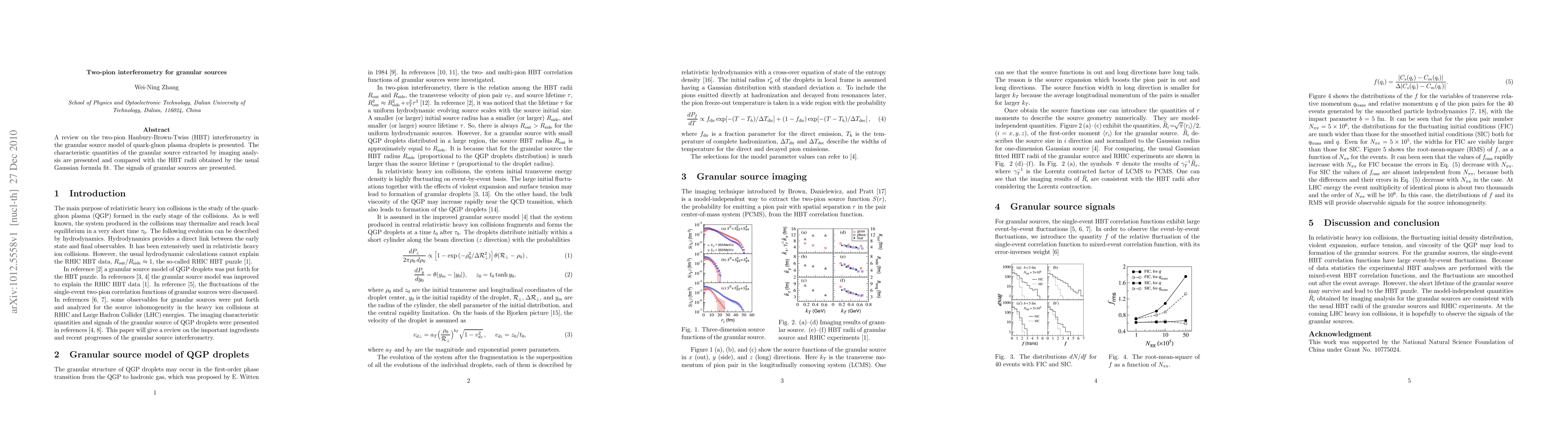 This paper reviews two-pion Hanbury-Brown-Twiss interferometry in granular sources of quark-gluon plasma droplets, comparing imaging analysis results with Gaussian fit HBT radii and presenting signals indicative of granular sources.
