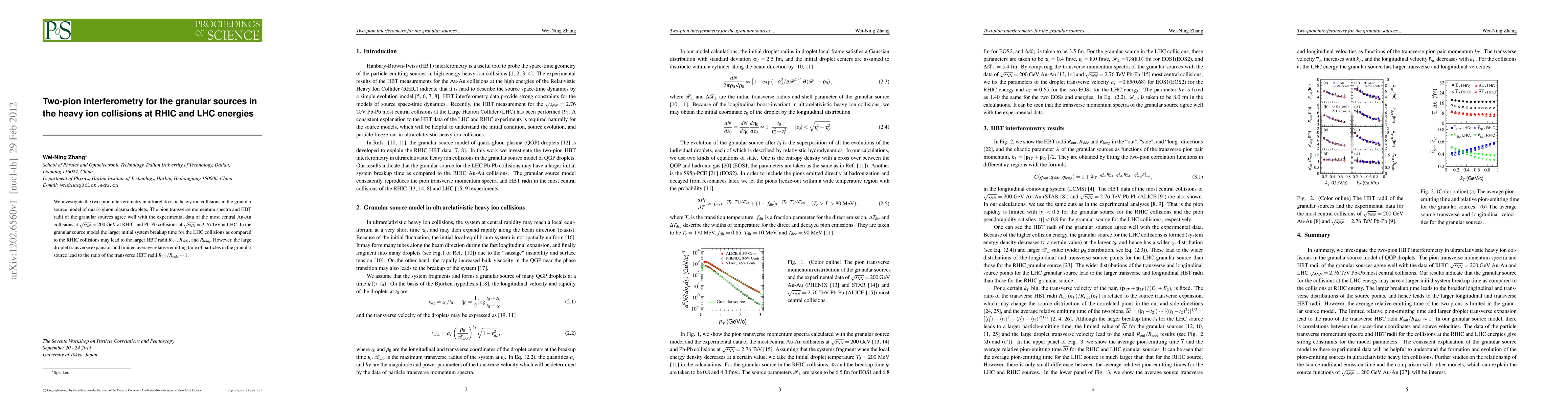 This paper examines two-pion interferometry in heavy ion collisions using a granular source model for quark-gluon plasma droplets, finding good agreement with experimental data from RHIC and LHC. The model suggests larger HBT radii at LHC due to longer breakup times, but transverse expansion and limited emitting time maintain a ratio of $R_{\rm out}/R_{\rm side} \sim 1$.