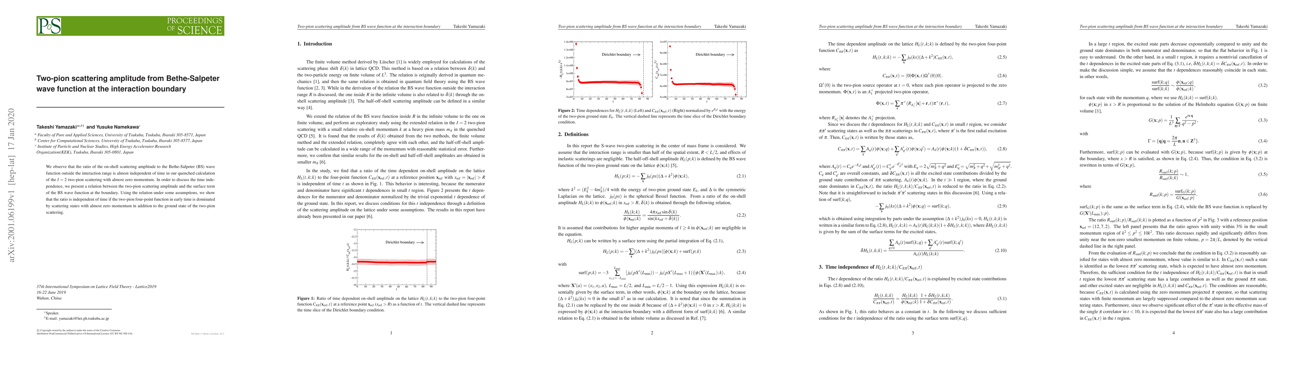 A study on two-pion scattering found that the ratio of the scattering amplitude to the Bethe-Salpeter wave function outside interaction ranges is almost time-independent under certain conditions.
