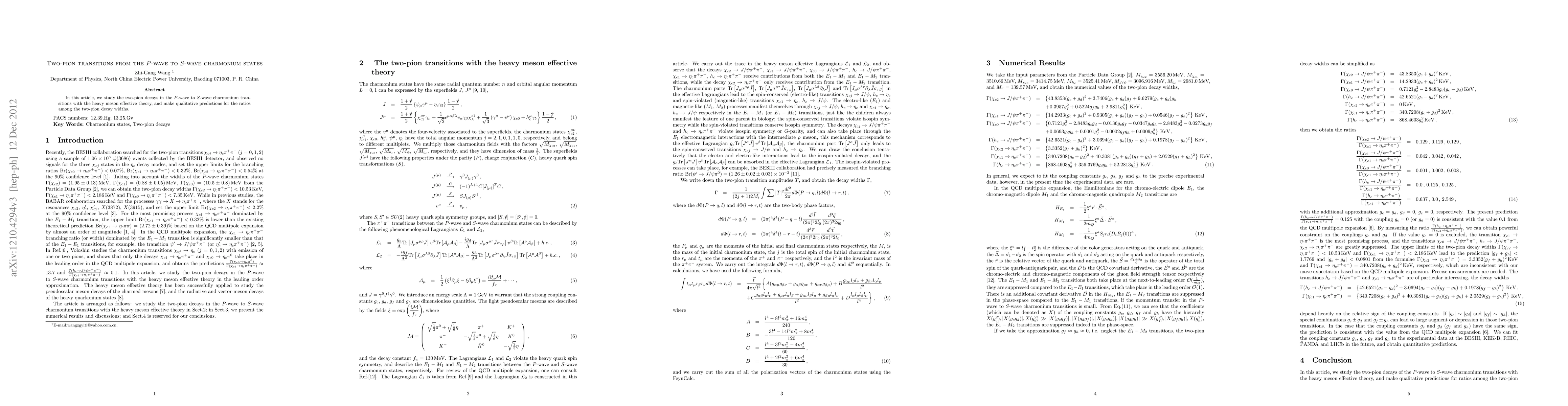 This research uses heavy meson effective theory to predict ratios of two-pion decay widths in transitions between $P$-wave and $S$-wave charmonium states.