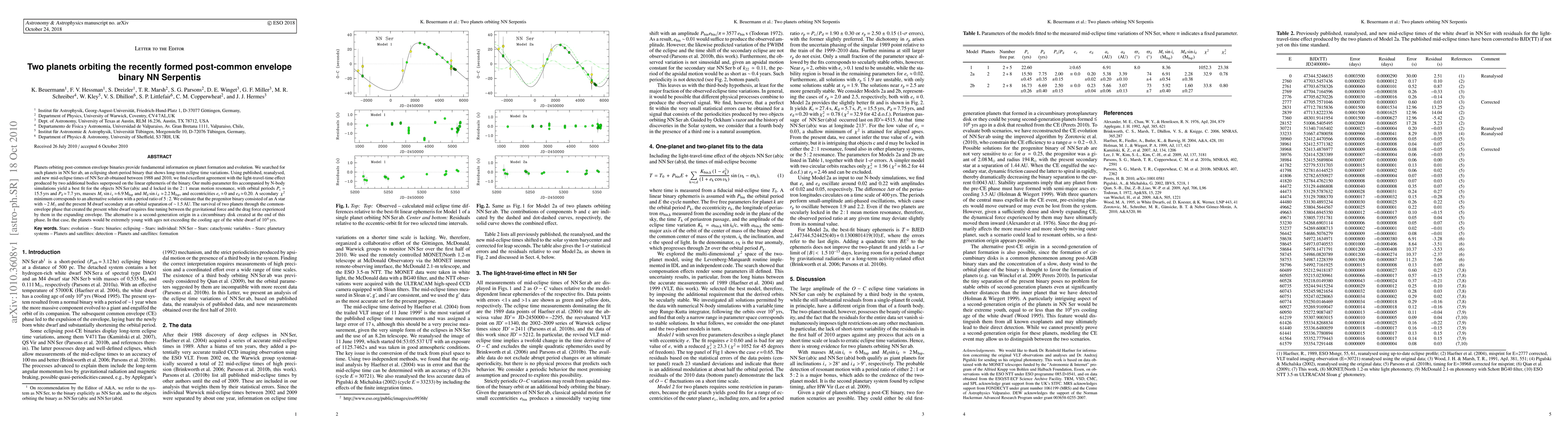 This paper reports the discovery of two planets orbiting the post-common envelope binary NN Serpentis, revealing their locked 2:1 mean motion resonance and suggesting their survival through the common-envelope phase or a second-generation origin in a circumbinary disk.