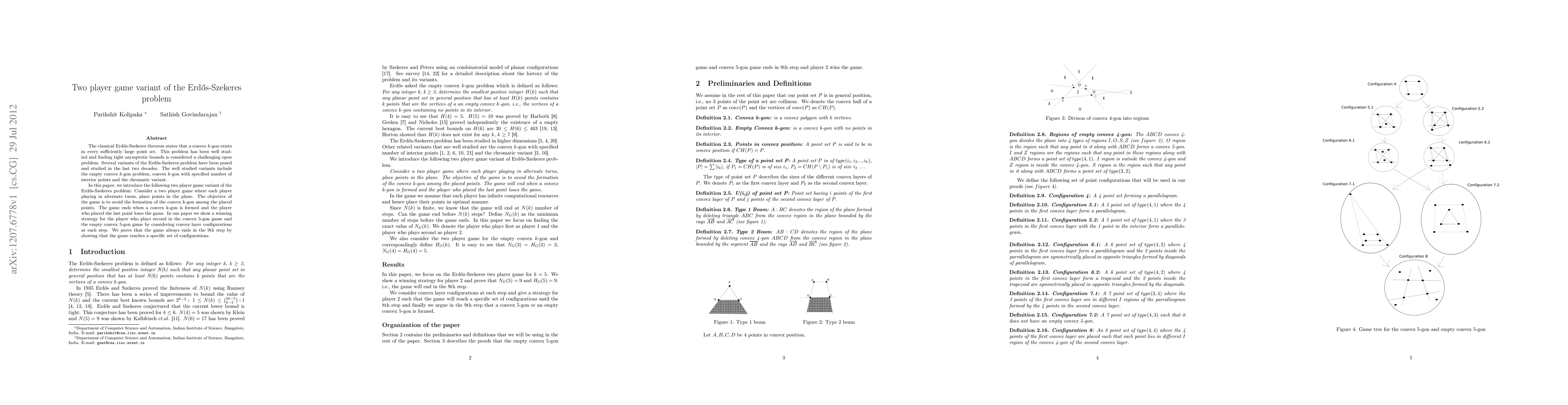This paper introduces a two-player game variant of the Erdos-Szekeres problem, where players alternately place points to avoid forming a convex 5-gon. It demonstrates a winning strategy for the second player and proves the game concludes within 9 steps through convex layer configurations.