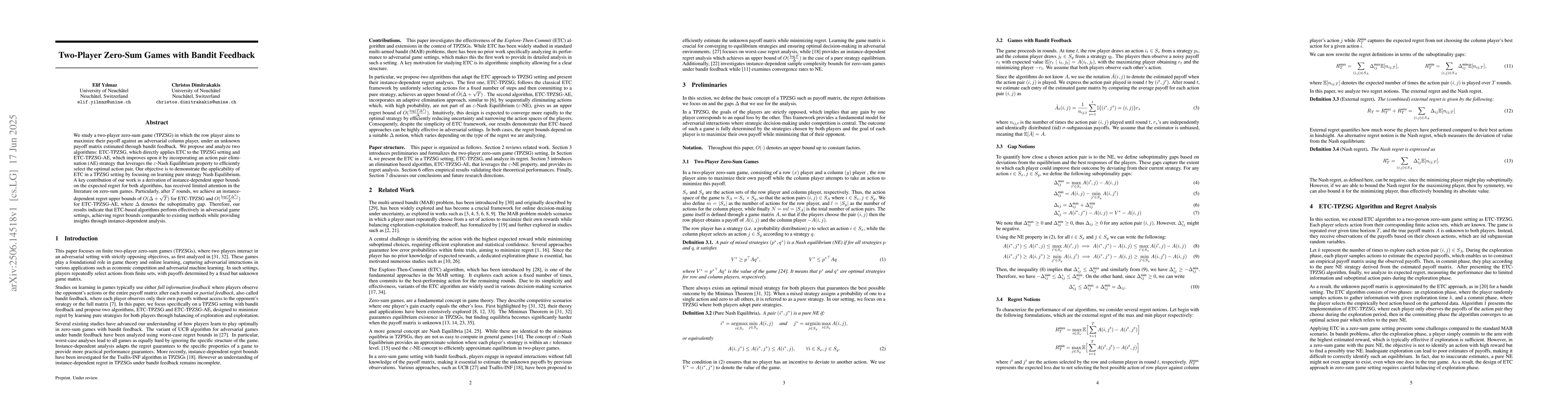 We study a two-player zero-sum game (TPZSG) in which the row player aims to maximize their payoff against an adversarial column player, under an unknown payoff matrix estimated through bandit feedback. We propose and analyze two algorithms: ETC-TPZSG, which directly applies ETC to the TPZSG setting and ETC-TPZSG-AE, which improves upon it by incorporating an action pair elimination (AE) strategy that leverages the $\varepsilon$-Nash Equilibrium property to efficiently select the optimal action pair. Our objective is to demonstrate the applicability of ETC in a TPZSG setting by focusing on learning pure strategy Nash Equilibrium. A key contribution of our work is a derivation of instance-dependent upper bounds on the expected regret for both algorithms, has received limited attention in the literature on zero-sum games. Particularly, after $T$ rounds, we achieve an instance-dependent regret upper bounds of $O(\Delta + \sqrt{T})$ for ETC-TPZSG and $O(\frac{\log (T \Delta^2)}{\Delta})$ for ETC-TPZSG-AE, where $\Delta$ denotes the suboptimality gap. Therefore, our results indicate that ETC-based algorithms perform effectively in adversarial game settings, achieving regret bounds comparable to existing methods while providing insights through instance-dependent analysis.