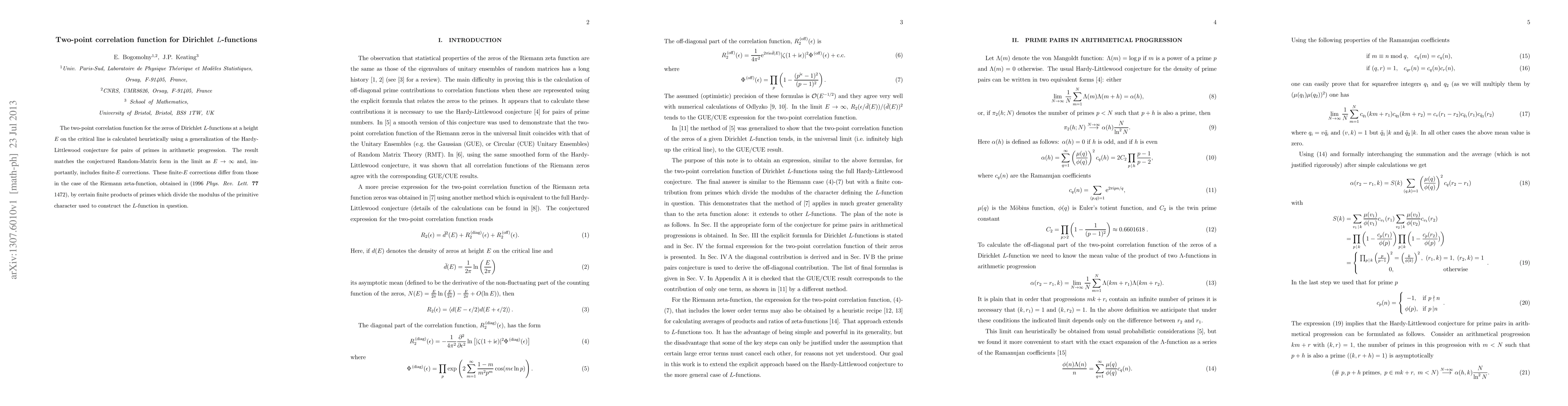 The two-point correlation function for the zeros of Dirichlet L-functions at a height E on the critical line is calculated heuristically using a generalization of the Hardy-Littlewood conjecture for pairs of primes in arithmetic progression. The result matches the conjectured Random-Matrix form in the limit as $E\rightarrow\infty$ and, importantly, includes finite-E corrections. These finite-E corrections differ from those in the case of the Riemann zeta-function, obtained in (1996 Phys. Rev. Lett. 77 1472), by certain finite products of primes which divide the modulus of the primitive character used to construct the L-function in question.