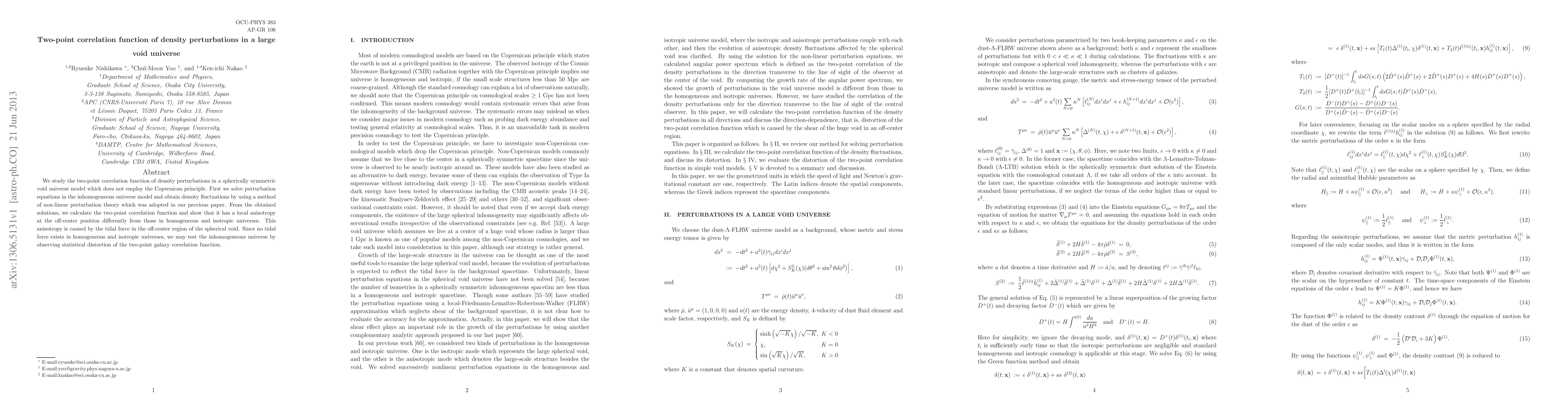 This paper investigates the two-point correlation function of density perturbations in a spherically symmetric void universe model, revealing local anisotropy due to tidal forces at off-center positions, contrasting with the isotropic nature of homogeneous universes. The findings suggest a potential observational method to test inhomogeneous universe models.