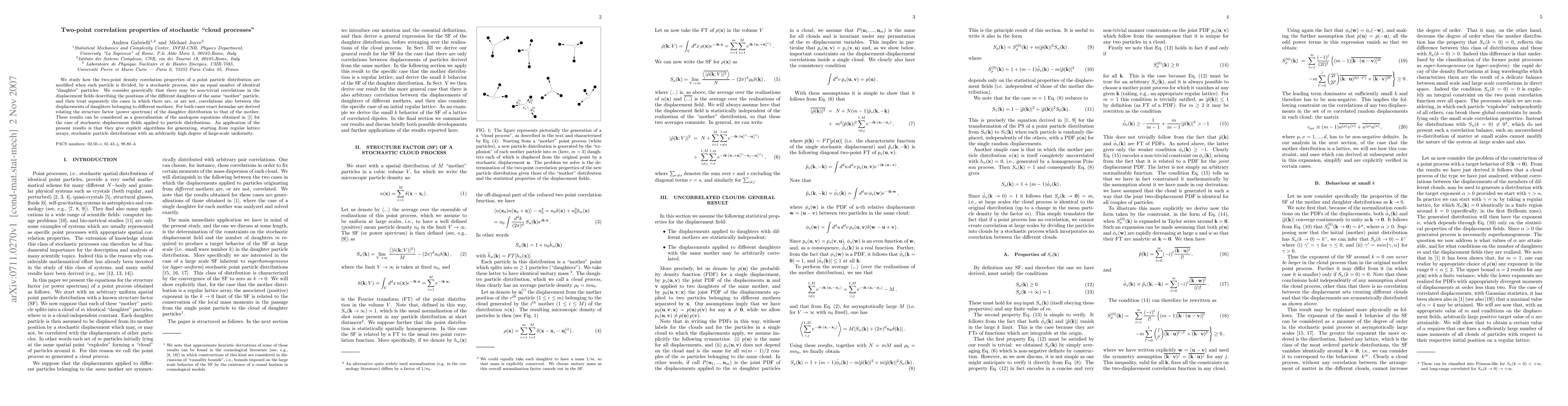 We study how the two-point density correlation properties of a point particle distribution are modified when each particle is divided, by a stochastic process, into an equal number of identical "daughter" particles. We consider generically that there may be non-trivial correlations in the displacement fields describing the positions of the different daughters of the same "mother" particle, and then treat separately the cases in which there are, or are not, correlations also between the displacements of daughters belonging to different mothers. For both cases exact formulae are derived relating the structure factor (power spectrum) of the daughter distribution to that of the mother. These results can be considered as a generalization of the analogous equations obtained in ref. [1] (cond-mat/0409594) for the case of stochastic displacement fields applied to particle distributions. An application of the present results is that they give explicit algorithms for generating, starting from regular lattice arrays, stochastic particle distributions with an arbitrarily high degree of large-scale uniformity.