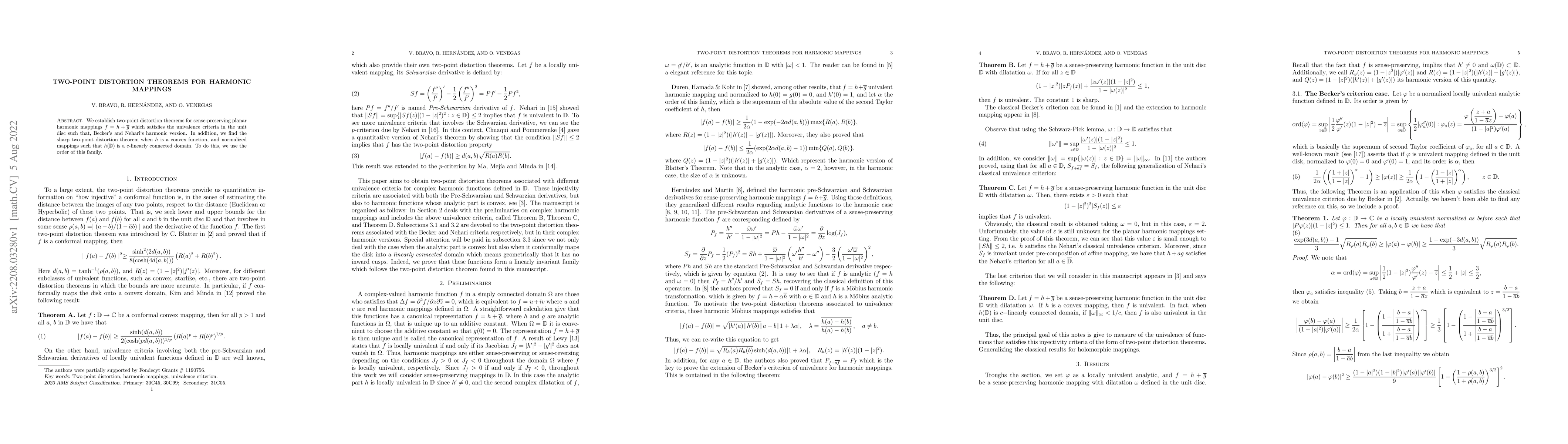 We establish two-point distortion theorems for sense-preserving planar harmonic mappings $f=h+\overline{g}$ which satisfies the univalence criteria in the unit disc such that, Becker's and Nehari`s harmonic version. In addition, we find the sharp two-point distortion theorem when $h$ is a convex function, and normalized mappings such that $h(\D)$ is a $c$-linearly connected domain. To do this, we use the order of this family.