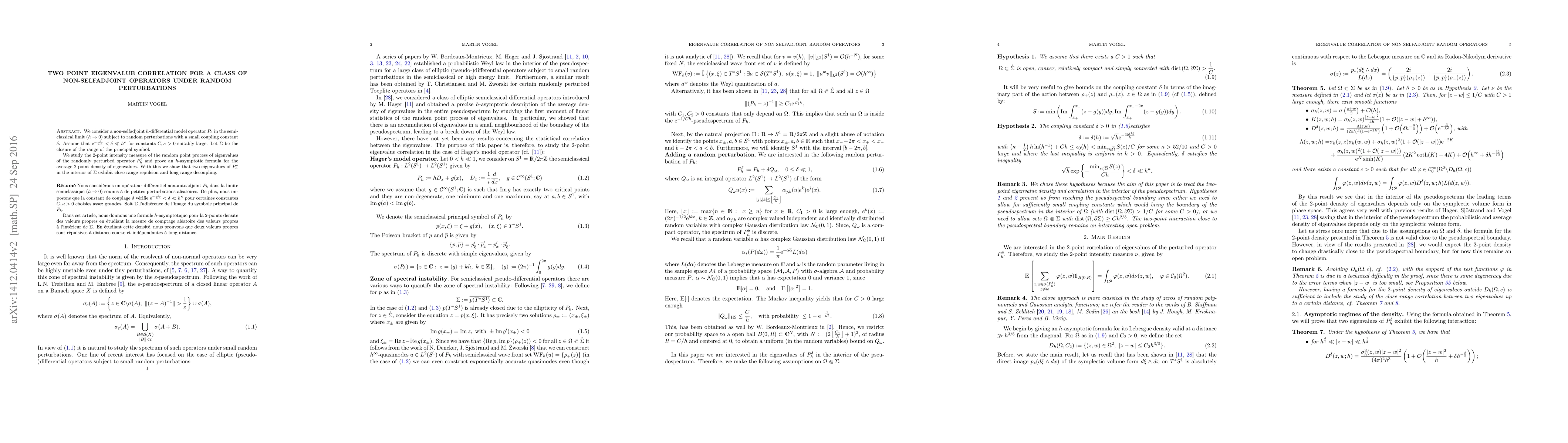 This paper studies the behavior of eigenvalues in a non-selfadjoint operator under random perturbations, showing that two eigenvalues exhibit close range repulsion and long-range decoupling with an asymptotic formula for their average density.