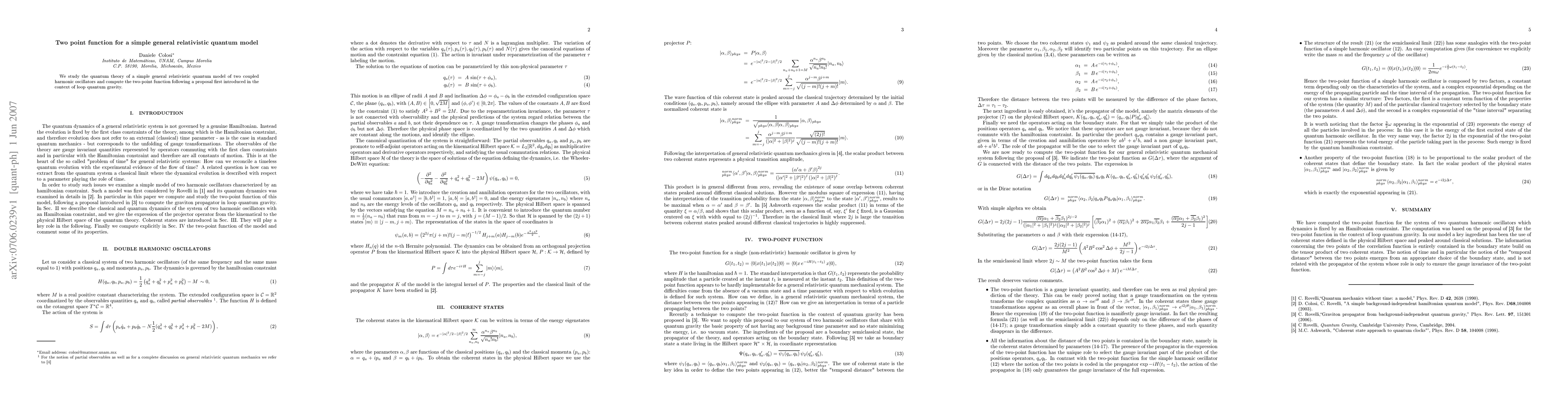 We study the quantum theory of a simple general relativistic quantum model of two coupled harmonic oscillators and compute the two-point function following a proposal first introduced in the context of loop quantum gravity.