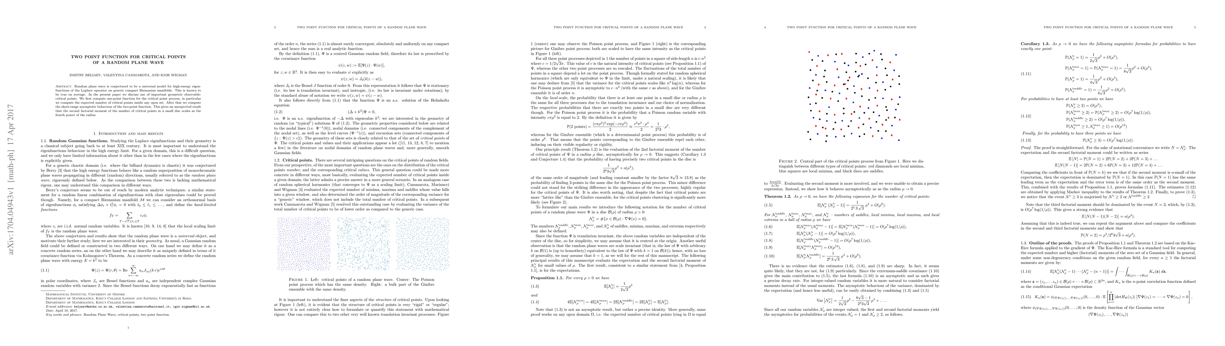Random plane wave is conjectured to be a universal model for high-energy eigenfunctions of the Laplace operator on generic compact Riemanian manifolds. This is known to be true on average. In the present paper we discuss one of important geometric observable: critical points. We first compute one-point function for the critical point process, in particular we compute the expected number of critical points inside any open set. After that we compute the short-range asymptotic behaviour of the two-point function. This gives an unexpected result that the second factorial moment of the number of critical points in a small disc scales as the fourth power of the radius.