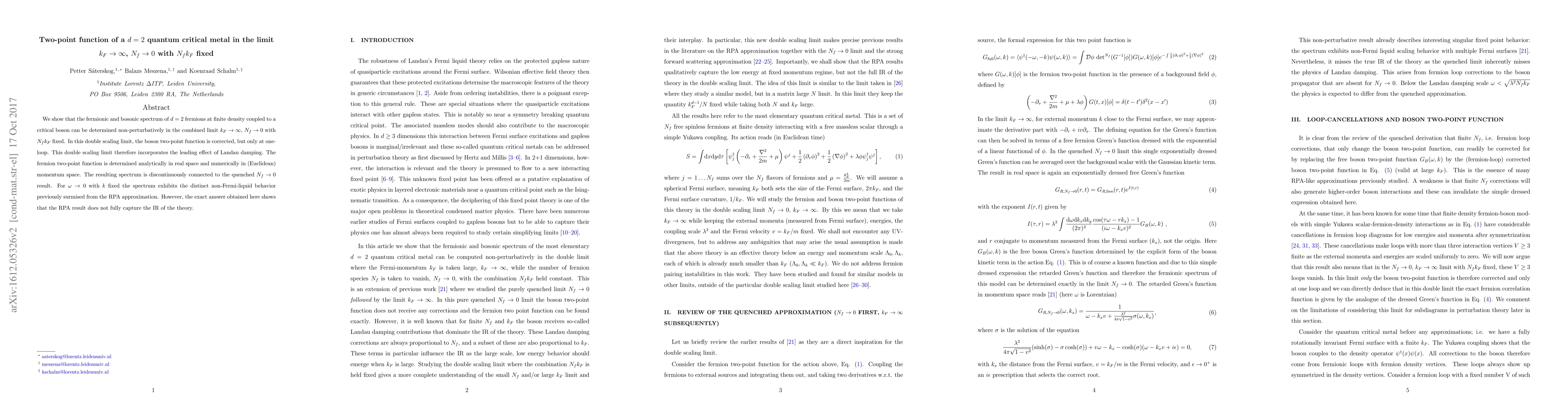 We show that the fermionic and bosonic spectrum of $d=2$ fermions at finite density coupled to a critical boson can be determined non-perturbatively in the combined limit $k_F\rightarrow {\infty}$, $N_f \rightarrow 0$ with $N_fk_F$ fixed. In this double scaling limit, the boson two-point function is corrected, but only at one-loop. This double scaling limit therefore incorporates the leading effect of Landau damping. The fermion two-point function is determined analytically in real space and numerically in (Euclidean) momentum space. The resulting spectrum is discontinuously connected to the quenched $N_f\rightarrow 0$ result. For $\omega \rightarrow 0$ with $k$ fixed the spectrum exhibits the distinct non-Fermi-liquid behavior previously surmised from the RPA approximation. However, the exact answer obtained here shows that the RPA result does not fully capture the IR of the theory.
