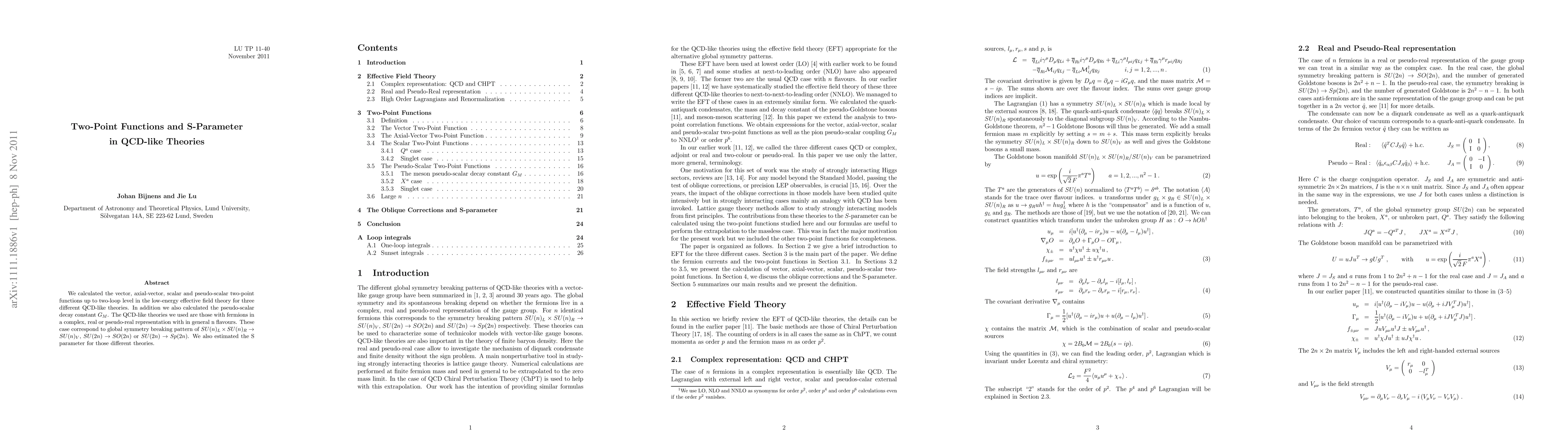 We calculated the vector, axial-vector, scalar and pseudo-scalar two-point functions up to two-loop level in the low-energy effective field theory for three different QCD-like theories. In addition we also calculated the pseudo-scalar decay constant $G_M$. The QCD-like theories we used are those with fermions in a complex, real or pseudo-real representation with in general n flavours. These case correspond to global symmetry breaking pattern of $SU(n)_L\times SU(n)_R\to SU(n)_V$, $SU(2n)\to SO(2n)$ or $SU(2n)\to Sp(2n)$. We also estimated the S parameter for those different theories.