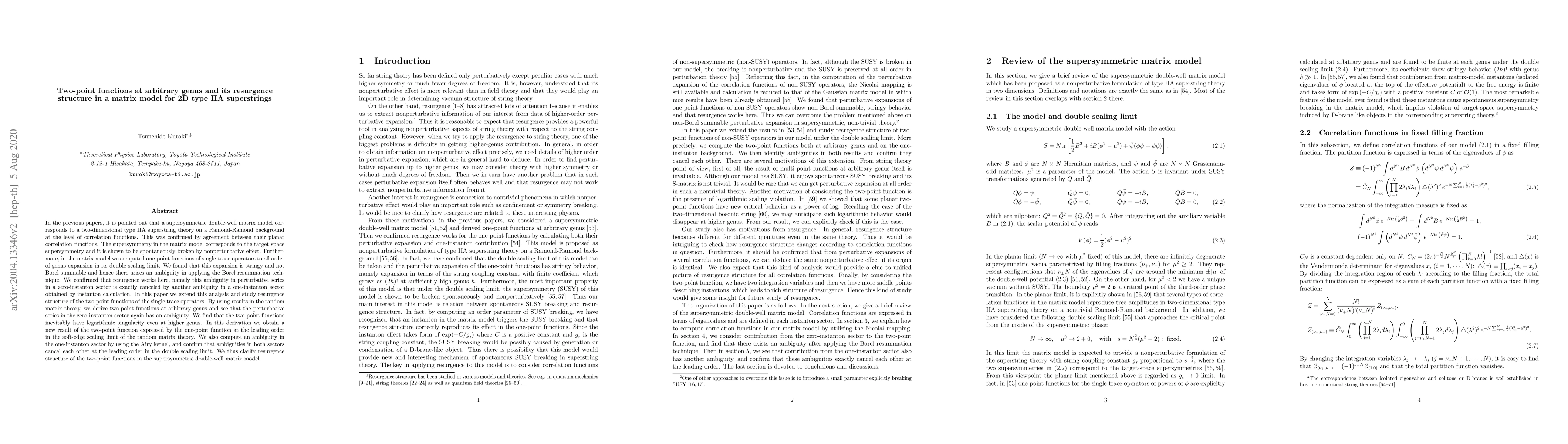 In the previous papers, it is pointed out that a supersymmetric double-well matrix model corresponds to a two-dimensional type IIA superstring theory on a Ramond-Ramond background at the level of correlation functions. This was confirmed by agreement between their planar correlation functions. The supersymmetry in the matrix model corresponds to the target space supersymmetry and it is shown to be spontaneously broken by nonperturbative effect. Furthermore, in the matrix model we computed one-point functions of single-trace operators to all order of genus expansion in its double scaling limit. We found that this expansion is stringy and not Borel summable and hence there arises an ambiguity in applying the Borel resummation technique. We confirmed that resurgence works here, namely this ambiguity in perturbative series in a zero-instanton sector is exactly canceled by another ambiguity in a one-instanton sector obtained by instanton calculation. In this paper we extend this analysis and study resurgence structure of the two-point functions of the single trace operators. By using results in the random matrix theory, we derive two-point functions at arbitrary genus and see that the perturbative series in the zero-instanton sector again has an ambiguity. We find that the two-point functions inevitably have logarithmic singularity even at higher genus. In this derivation we obtain a new result of the two-point function expressed by the one-point function at the leading order in the soft-edge scaling limit of the random matrix theory. We also compute an ambiguity in the one-instanton sector by using the Airy kernel, and confirm that ambiguities in both sectors cancel each other at the leading order in the double scaling limit. We thus clarify resurgence structure of the two-point functions in the supersymmetric double-well matrix model.