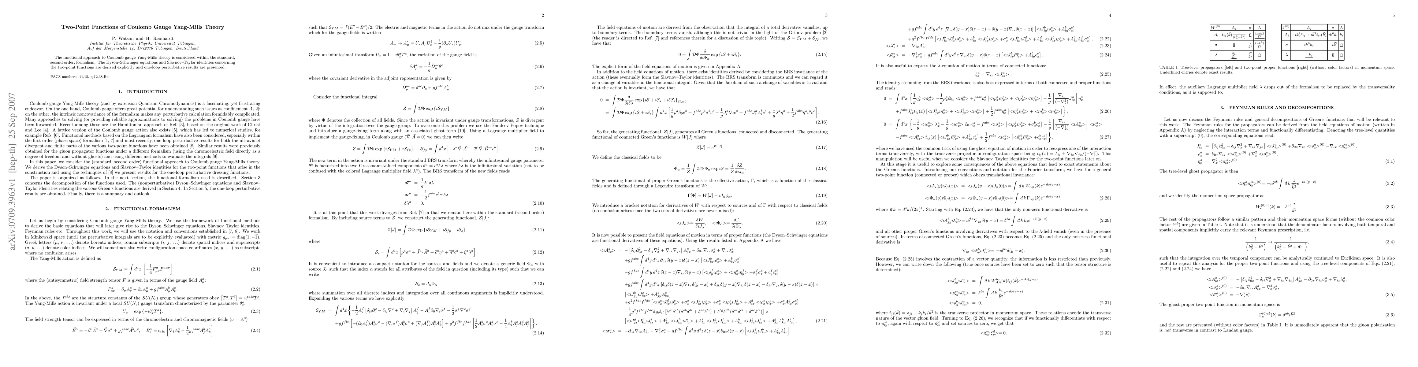 The functional approach to Coulomb gauge Yang-Mills theory is considered within the standard, second order, formalism. The Dyson-Schwinger equations and Slavnov-Taylor identities concerning the two-point functions are derived explicitly and one-loop perturbative results are presented.