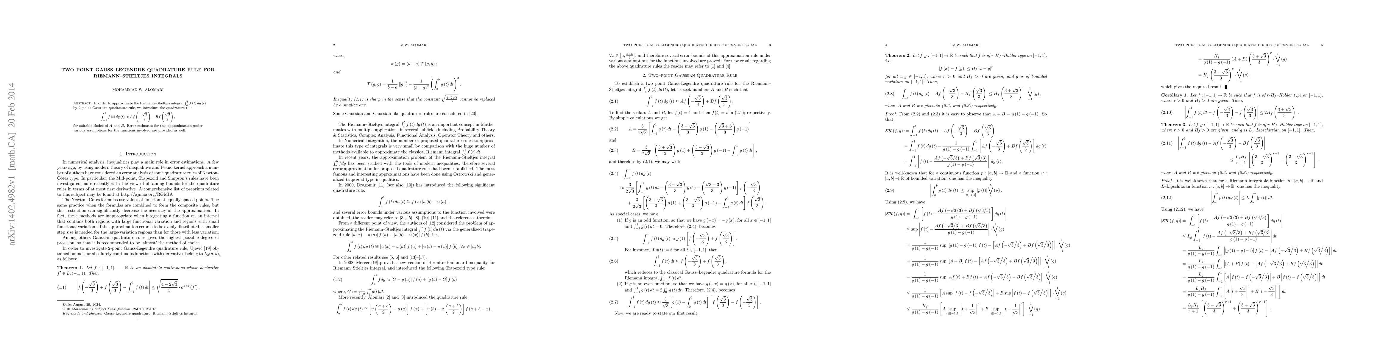 This paper introduces a two-point Gauss-Legendre quadrature rule to approximate Riemann-Stieltjes integrals, specifically $\int_a^b f(t)dg(t)$, using the formula $A f(-\sqrt{3}/3) + B f(\sqrt{3}/3)$. It also provides error estimates for the approximation under various assumptions about the functions involved.