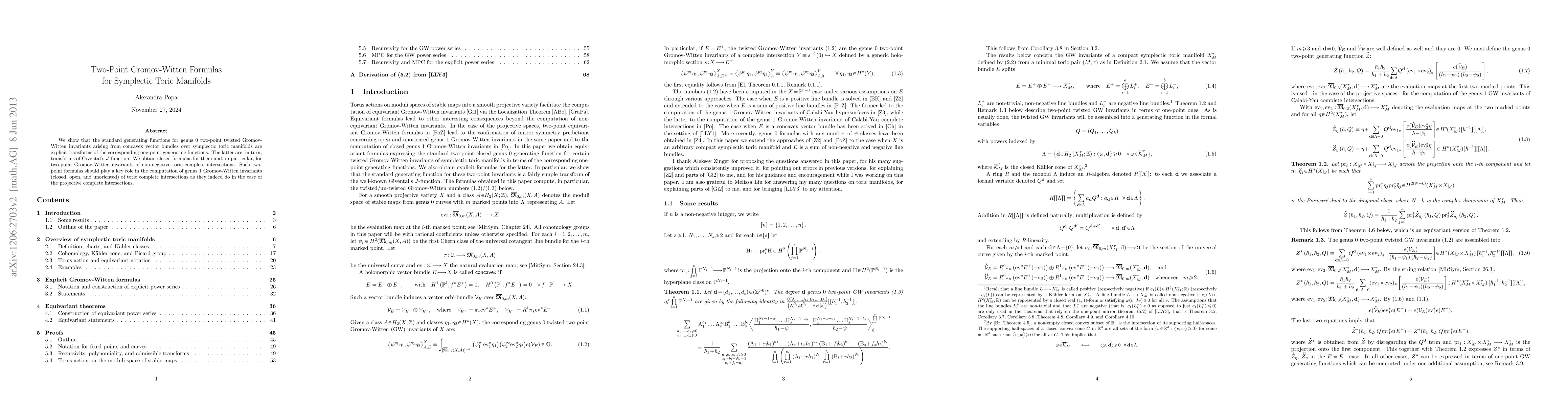 This paper derives explicit closed formulas for genus 0 two-point twisted Gromov-Witten invariants on symplectic toric manifolds, showing they transform from one-point generating functions, which are related to Givental's J-function. These formulas are crucial for computing genus 1 Gromov-Witten invariants of non-negative toric complete intersections.