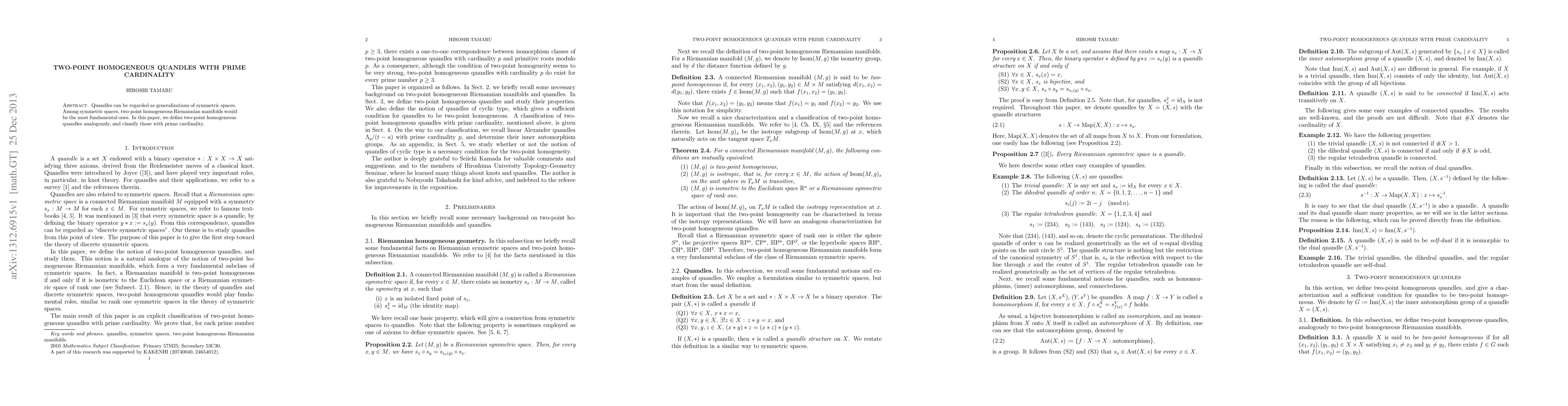 This paper defines two-point homogeneous quandles as generalizations of symmetric spaces and provides a classification of these quandles when they have prime cardinality. The study focuses on the structural properties and specific instances of these mathematical objects.