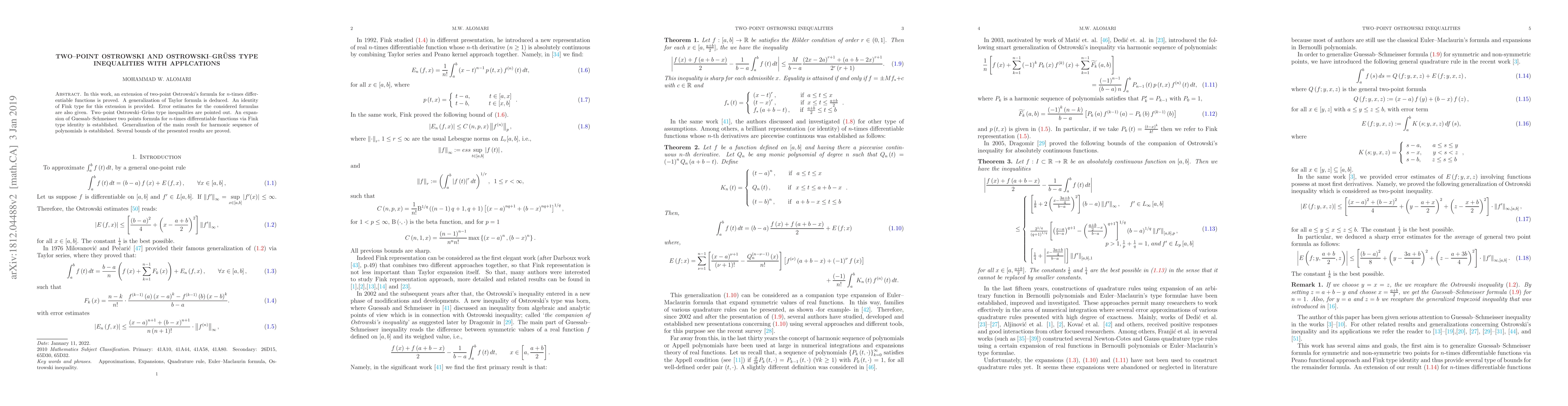 This paper proves an extension of two-point Ostrowski's formula for n-times differentiable functions, establishes a generalization of Taylor formula, and provides error estimates with applications to Fink type identity, Guessab-Schmeisser two points formula, and harmonic sequence of polynomials.