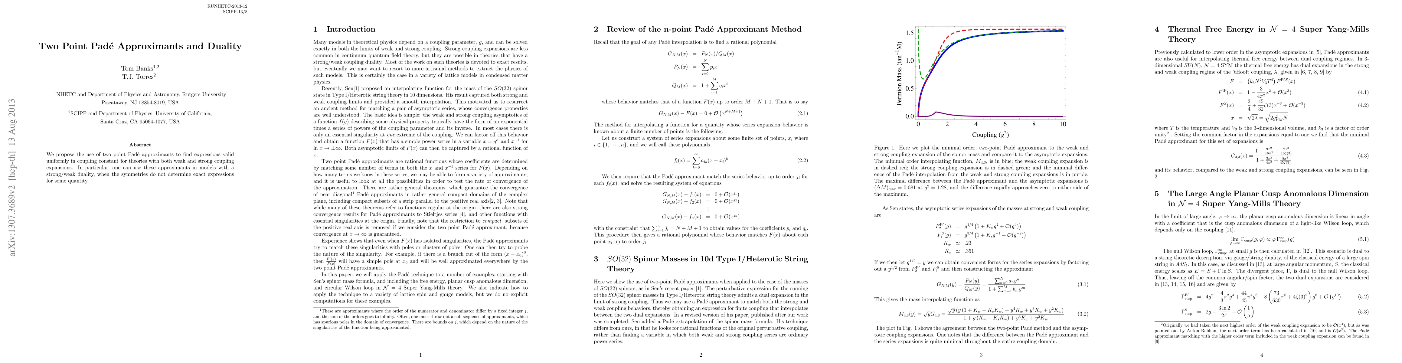 Two-line summary: This paper introduces two point Pade approximants for uniformly valid expressions in coupling constants across weak and strong coupling regimes. It specifically applies these methods to models exhibiting strong/weak duality where symmetries fail to yield exact quantities.