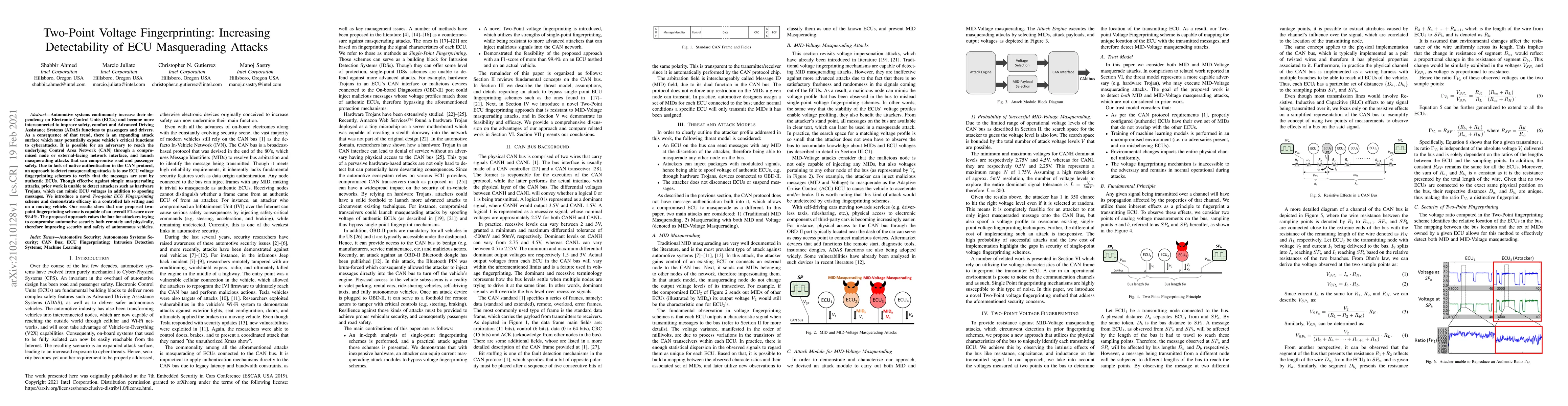 Automotive systems continuously increase their dependency on Electronic Control Units (ECUs) and become more interconnected to improve safety, comfort and Advanced Driving Assistance Systems (ADAS) functions to passengers and drivers. As a consequence of that trend, there is an expanding attack surface which may potentially expose vehicle's critical functions to cyberattacks. It is possible for an adversary to reach the underlying Control Area Network (CAN) through a compromised node or external-facing network interface, and launch masquerading attacks that can compromise road and passenger safety. Due to lack of native authentication in the CAN protocol, an approach to detect masquerading attacks is to use ECU voltage fingerprinting schemes to verify that the messages are sent by authentic ECUs. Though effective against simple masquerading attacks, prior work is unable to detect attackers such as hardware Trojans, which can mimic ECU voltages in addition to spoofing messages. We introduce a novel Two-point ECU Fingerprinting scheme and demonstrate efficacy in a controlled lab setting and on a moving vehicle. Our results show that our proposed two-point fingerprinting scheme is capable of an overall F1-score over 99.4%. The proposed approach raises the bar for attackers trying to compromise automotive security both remotely and physically, therefore improving security and safety of autonomous vehicles.