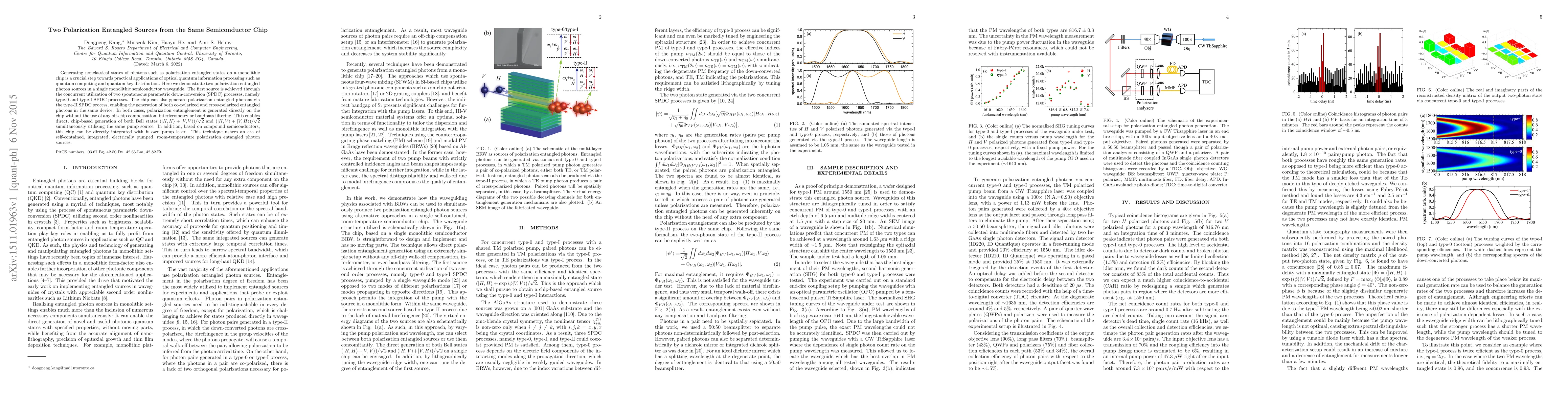 This paper presents a semiconductor chip generating two polarization entangled photon sources via spontaneous parametric down-conversion processes. It enables direct on-chip creation of both co-polarized and cross-polarized entangled photons without external compensation, paving the way for integrated, self-contained quantum information systems.