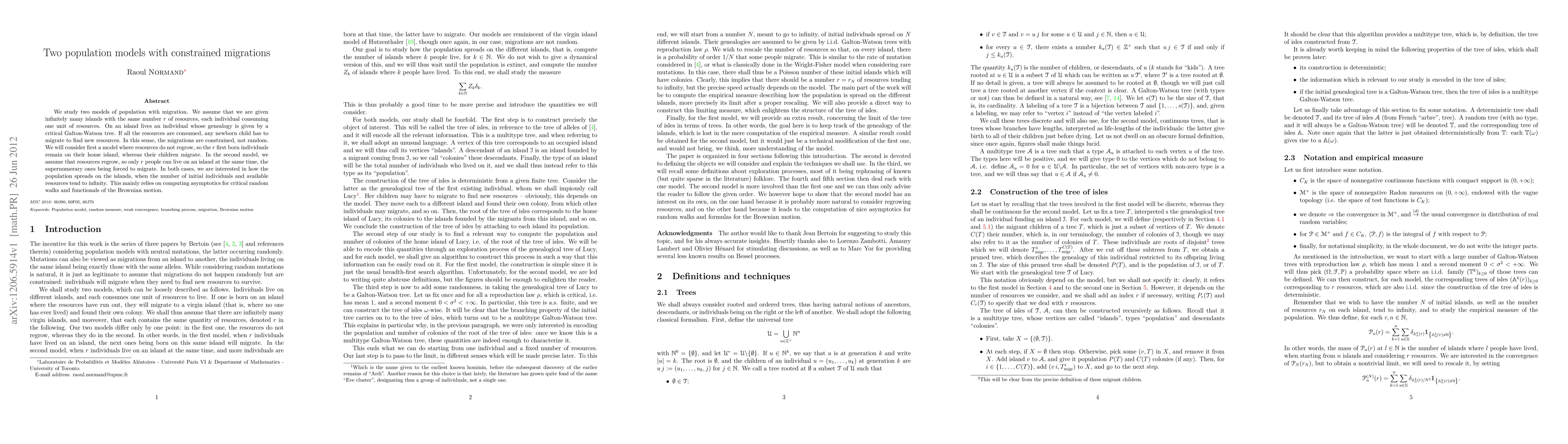 We study two models of population with migration. We assume that we are given infinitely many islands with the same number r of resources, each individual consuming one unit of resources. On an island lives an individual whose genealogy is given by a critical Galton-Watson tree. If all the resources are consumed, any newborn child has to migrate to find new resources. In this sense, the migrations are constrained, not random. We will consider first a model where resources do not regrow, so the r first born individuals remain on their home island, whereas their children migrate. In the second model, we assume that resources regrow, so only r people can live on an island at the same time, the supernumerary ones being forced to migrate. In both cases, we are interested in how the population spreads on the islands, when the number of initial individuals and available resources tend to infinity. This mainly relies on computing asymptotics for critical random walks and functionals of the Brownian motion.