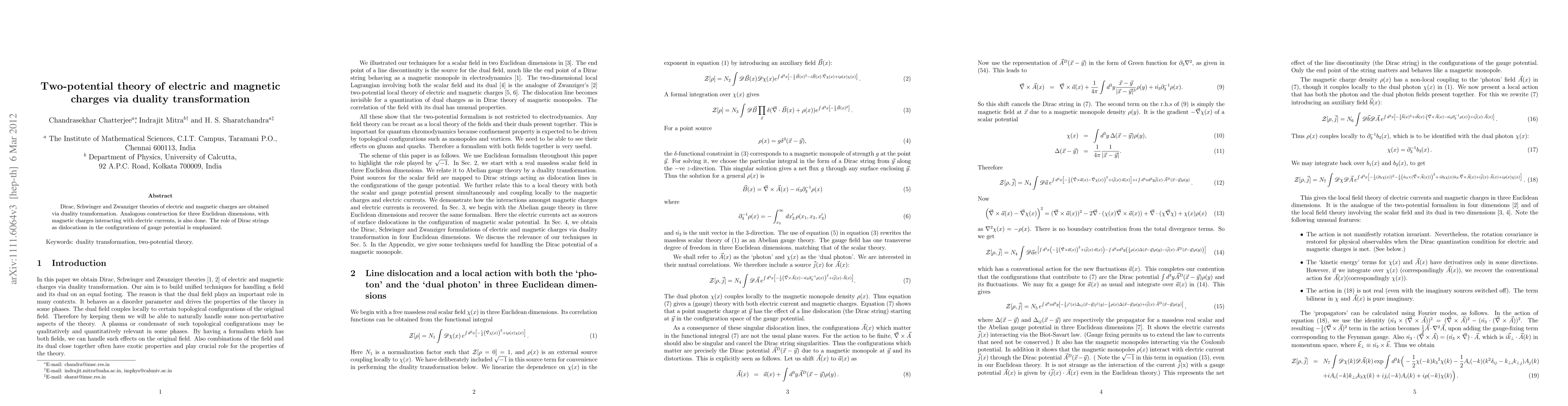 Dirac, Schwinger and Zwanziger theories of electric and magnetic charges are obtained via duality transformation. Analogous construction for three Euclidean dimensions, with magnetic charges interacting with electric currents, is also done. The role of Dirac strings as dislocations in the configurations of gauge potential is emphasized.
