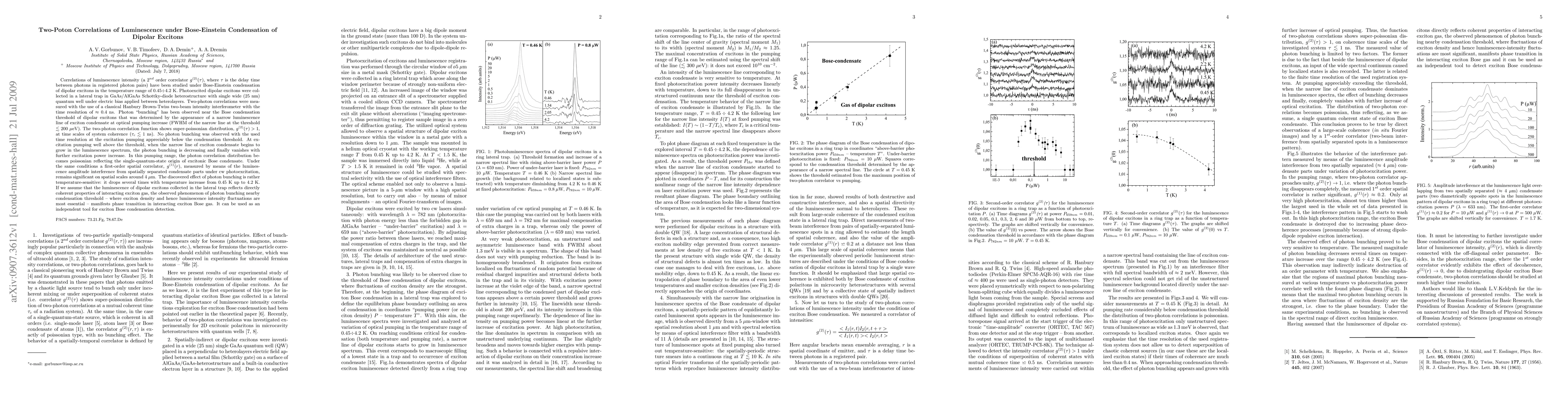 This study investigates two-photon correlations of luminescence in GaAs/AlGaAs heterostructures undergoing Bose-Einstein condensation of dipolar excitons, revealing photon "bunching" near the condensation threshold indicative of a phase transition in the exciton gas. The phenomenon diminishes as the exciton condensate forms, reflecting the single-quantum-state nature of the condensate.