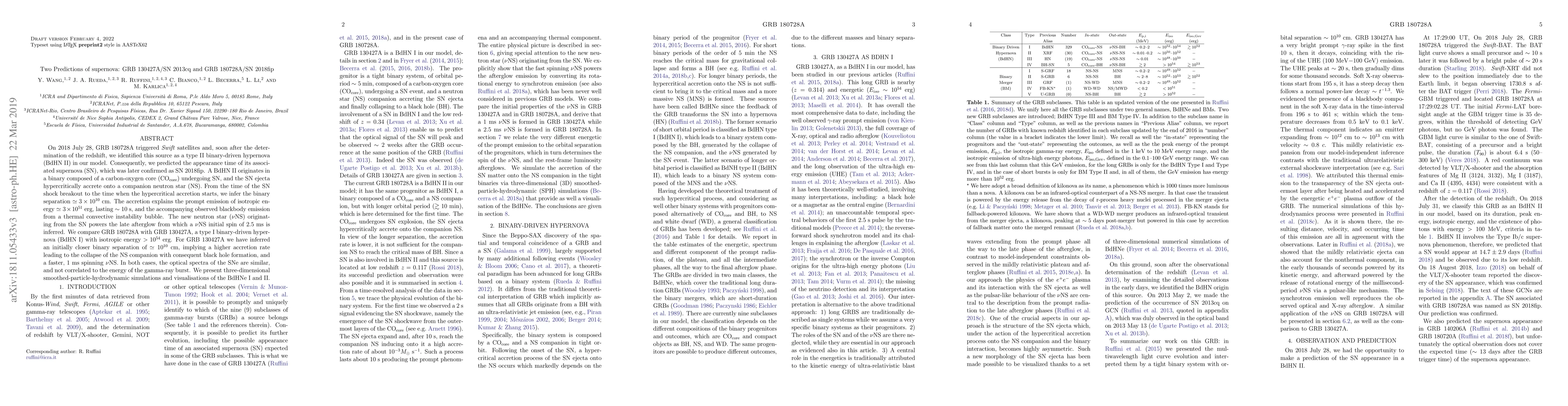 This paper predicts and confirms the appearance of supernovae SN 2018fip and SN 2013cq associated with gamma-ray bursts GRB 180728A and GRB 130427A, respectively. It models these as binary-driven hypernovae, explaining the bursts' energetics and accretion dynamics.