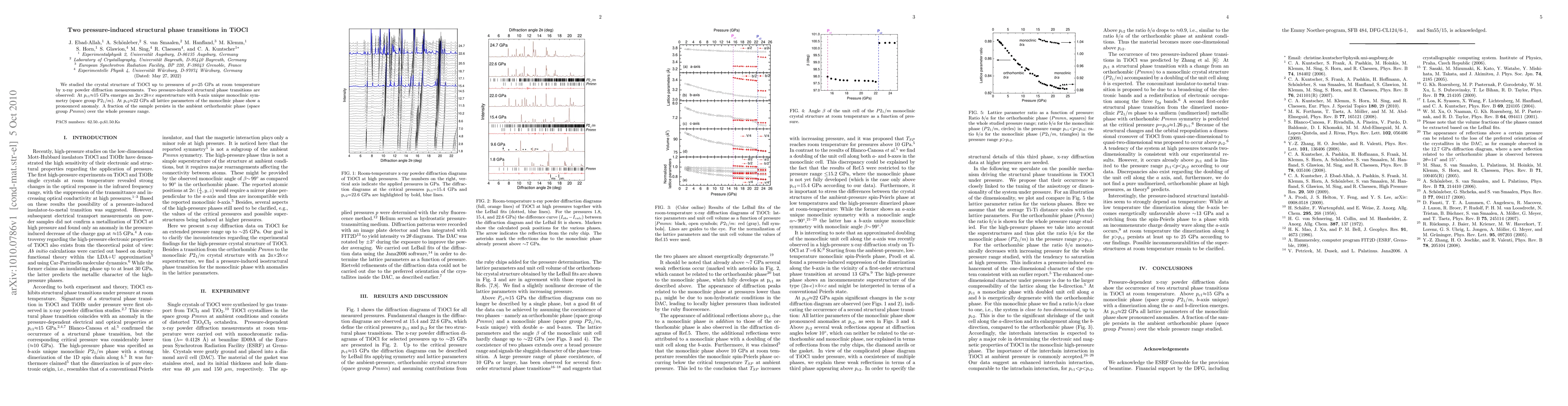 This study reveals two pressure-induced structural phase transitions in TiOCl up to 25 GPa, with a first transition at ~15 GPa forming a monoclinic superstructure and a second at ~22 GPa causing an anomaly in the monoclinic phase while some sample remains in the ambient orthorhombic phase.
