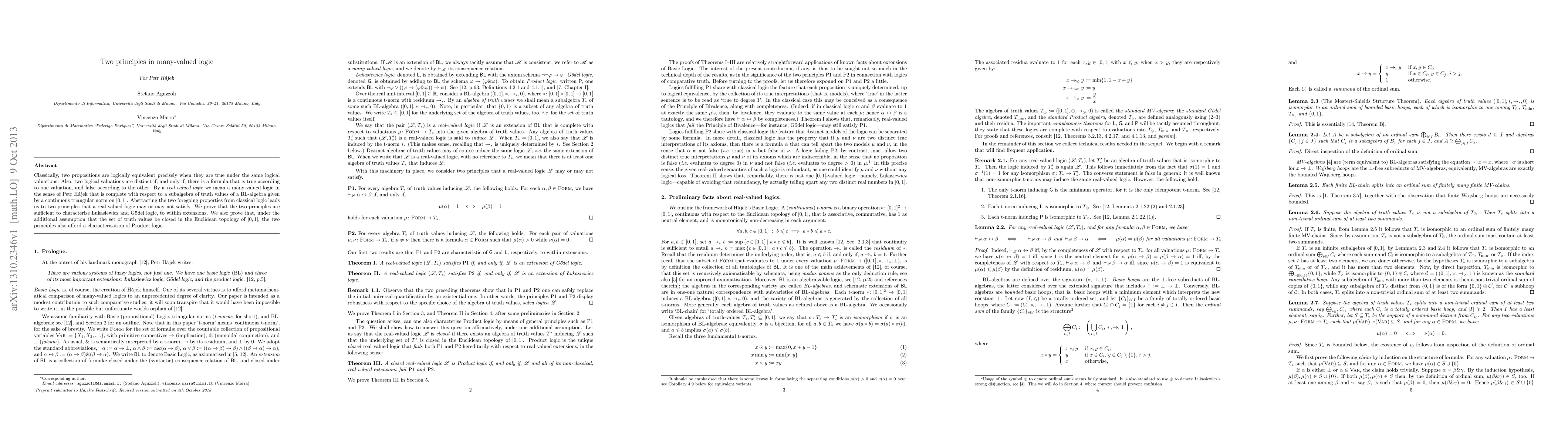 Classically, two propositions are logically equivalent precisely when they are true under the same logical valuations. Also, two logical valuations are distinct if, and only if, there is a formula that is true according to one valuation, and false according to the other. By a real-valued logic we mean a many-valued logic in the sense of Petr H\'ajek that is complete with respect to a subalgebra of truth values of a BL-algebra given by a continuous triangular norm on [0, 1]. Abstracting the two foregoing properties from classical logic leads us to two principles that a real-valued logic may or may not satisfy. We prove that the two principles are sufficient to characterise {\L}ukasiewicz and G\"odel logic, to within extensions. We also prove that, under the additional assumption that the set of truth values be closed in the Euclidean topology of [0,1], the two principles also afford a characterisation of Product logic.