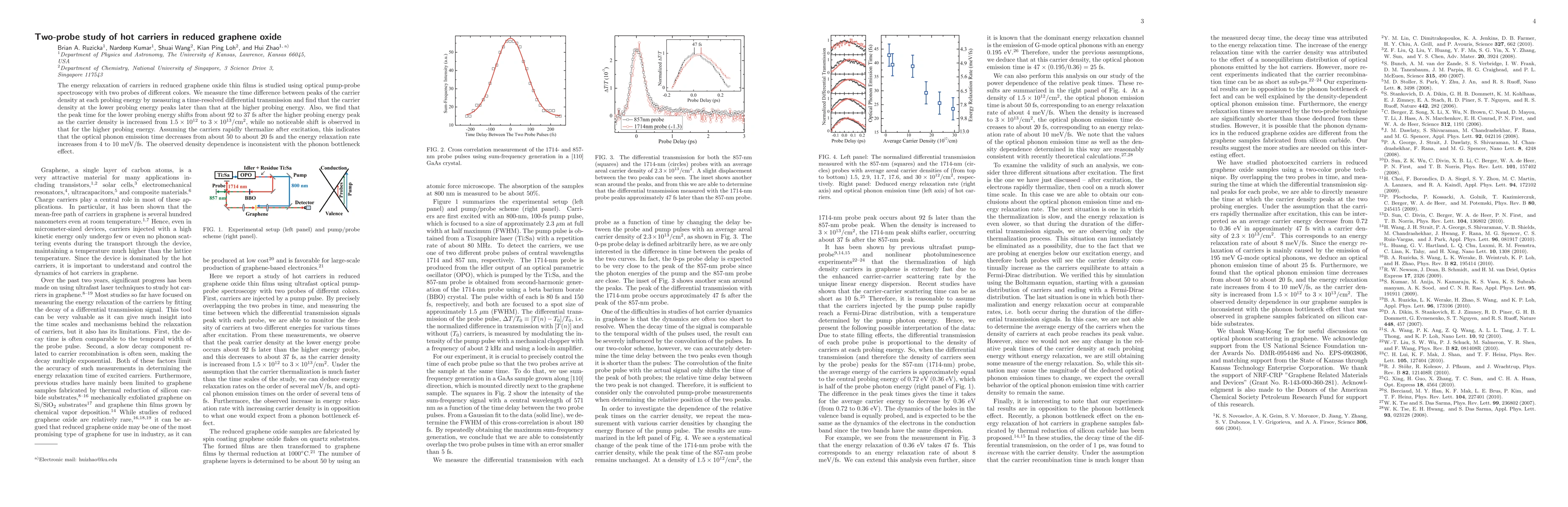 The study investigates the time-resolved energy relaxation of hot carriers in reduced graphene oxide using two-probe optical pump-probe spectroscopy, revealing a significant delay in carrier density peak time at lower probing energy as carrier density increases. The findings suggest enhanced energy relaxation rate and faster optical phonon emission with increased carrier density, defying the phonon bottleneck effect.