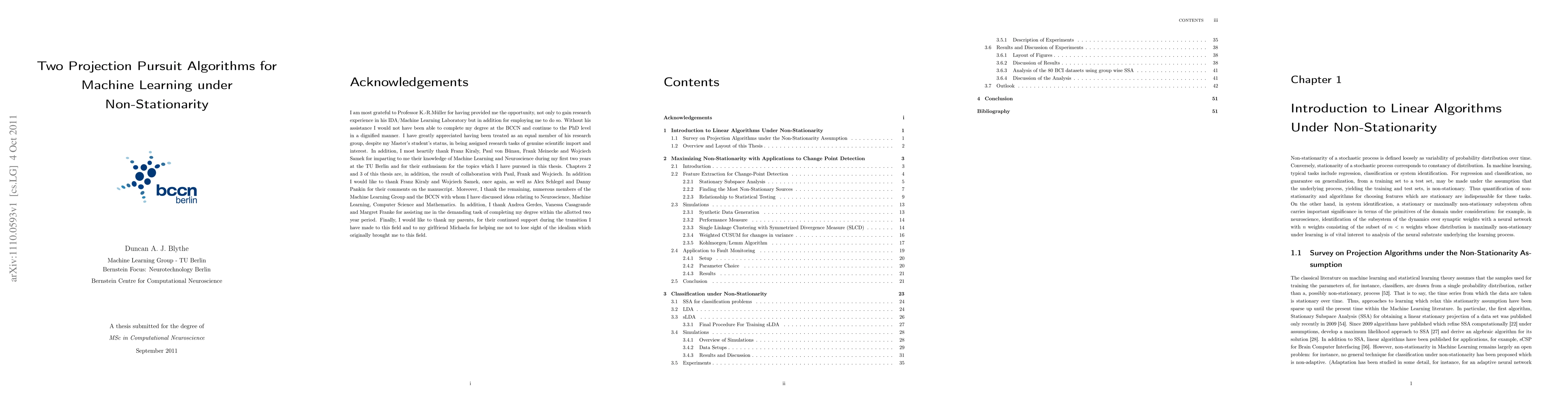 This thesis derives, tests and applies two linear projection algorithms for machine learning under non-stationarity. The first finds a direction in a linear space upon which a data set is maximally non-stationary. The second aims to robustify two-way classification against non-stationarity. The algorithm is tested on a key application scenario, namely Brain Computer Interfacing.