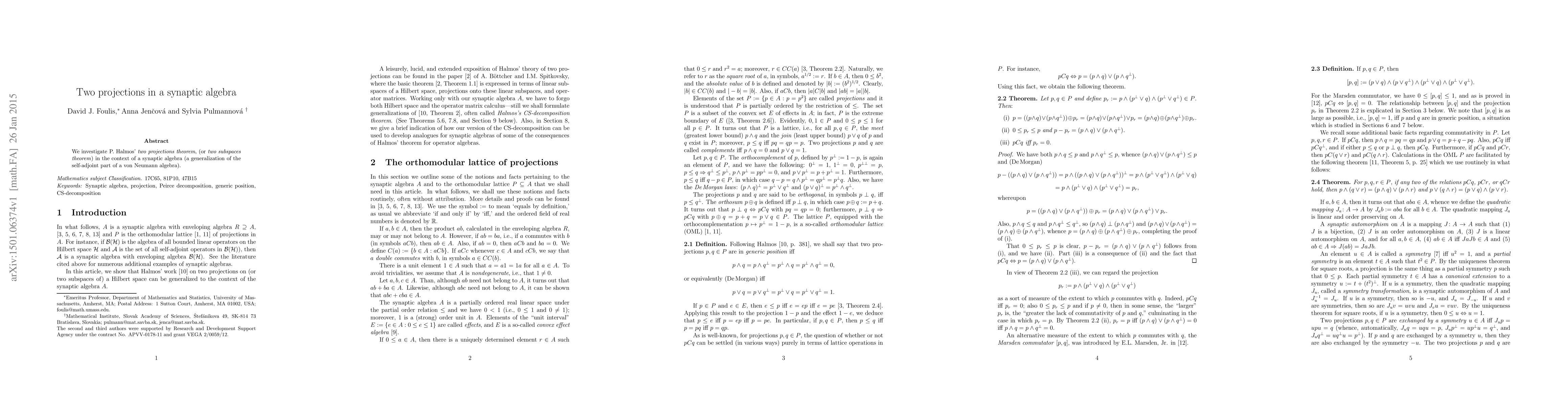 This paper investigates a theorem in mathematics that generalizes von Neumann algebras to synaptic algebras, focusing on two key projections and their implications.