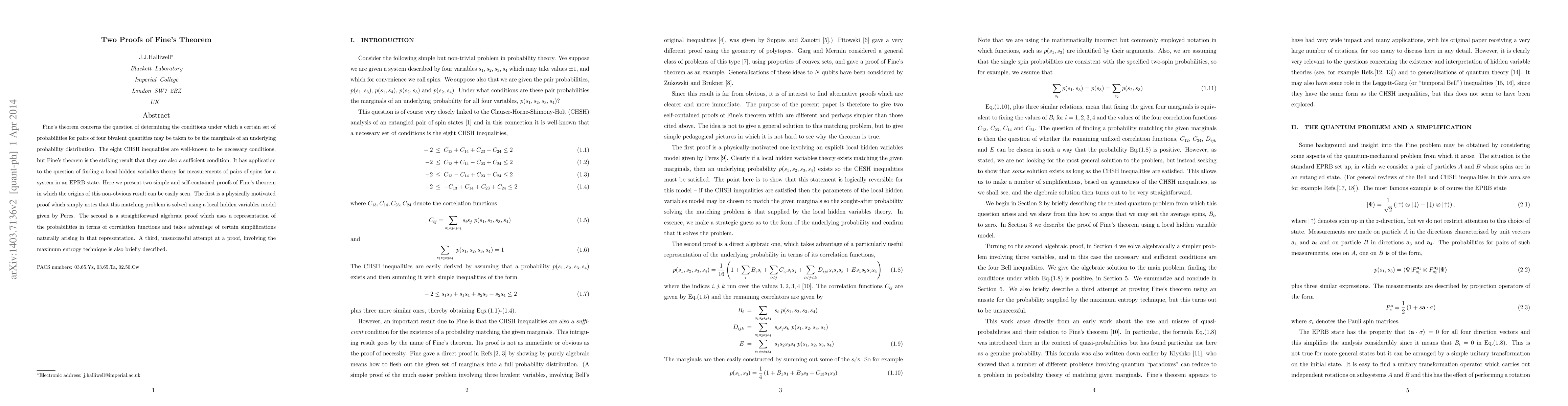 Fine's theorem asserts that the eight CHSH inequalities are both necessary and sufficient for a set of probabilities for pairs of four bivalent quantities to be marginals of an underlying probability distribution. This paper presents two proofs: a physically motivated proof using Peres' local hidden variables model and a straightforward algebraic proof utilizing correlation functions.