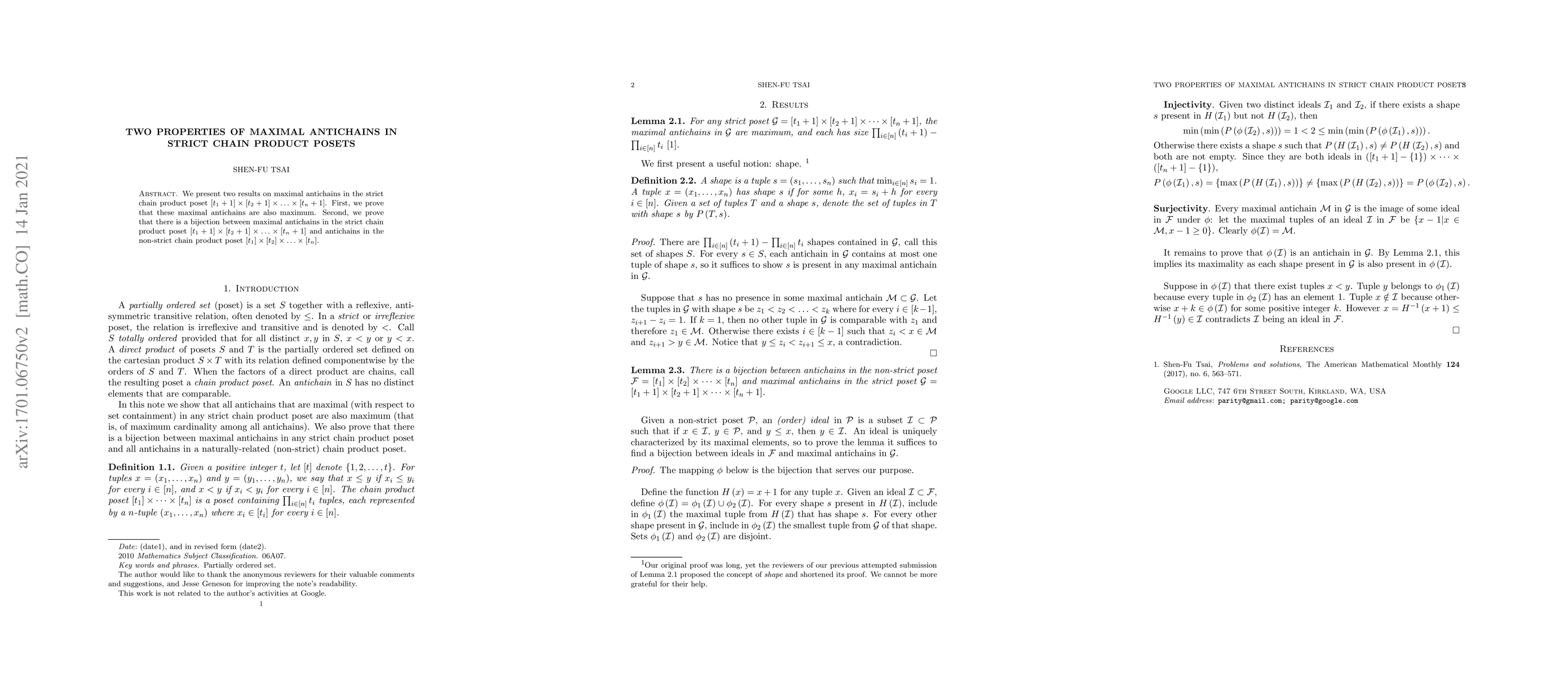 We present two results on maximal antichains in the strict chain product poset $[t_1+1]\times[t_2+1]\times\ldots\times[t_n+1]$. First, we prove that these maximal antichains are also maximum. Second, we prove that there is a bijection between maximal antichains in the strict chain product poset $[t_1+1]\times[t_2+1]\times\ldots\times[t_n+1]$ and antichains in the non-strict chain product poset $[t_1]\times[t_2]\times\ldots\times[t_n]$.