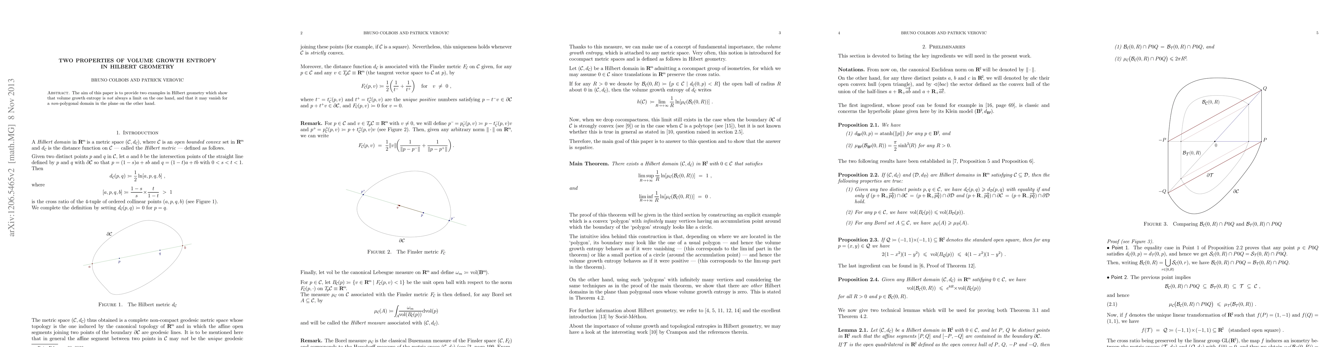 The aim of this paper is to provide two examples in Hilbert geometry which show that volume growth entropy is not always a limit on the one hand, and that it may vanish for a non-polygonal domain in the plane on the other hand.