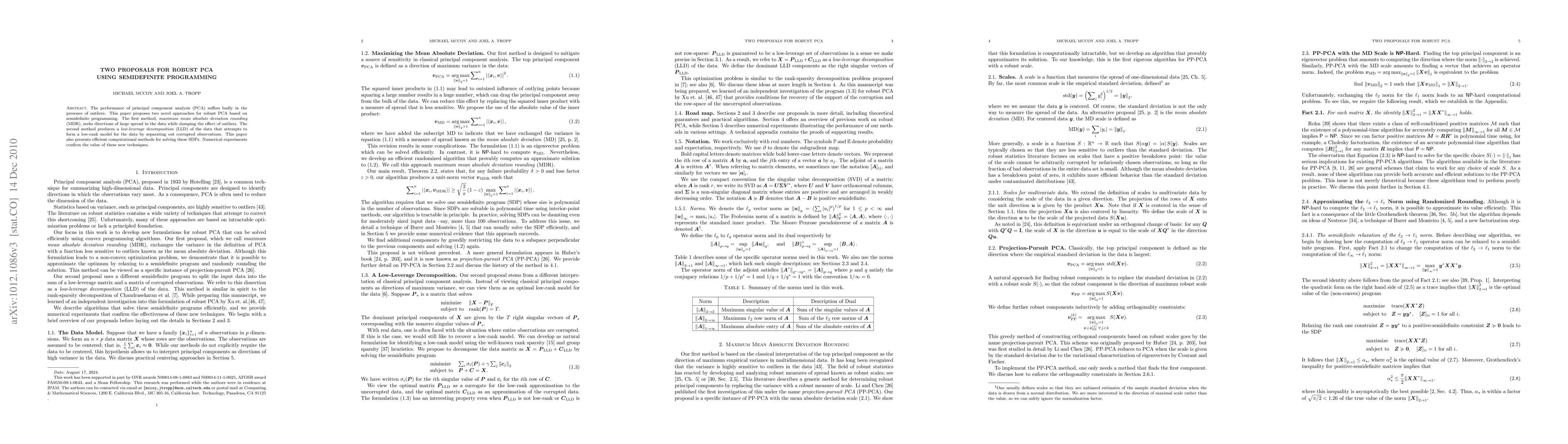 This paper introduces two robust PCA methods using semidefinite programming to handle outliers: maximum mean absolute deviation rounding (MDR) and low-leverage decomposition (LLD). Both methods aim to improve PCA performance by mitigating the impact of outliers, with efficient computational solutions and confirmed effectiveness through numerical experiments.