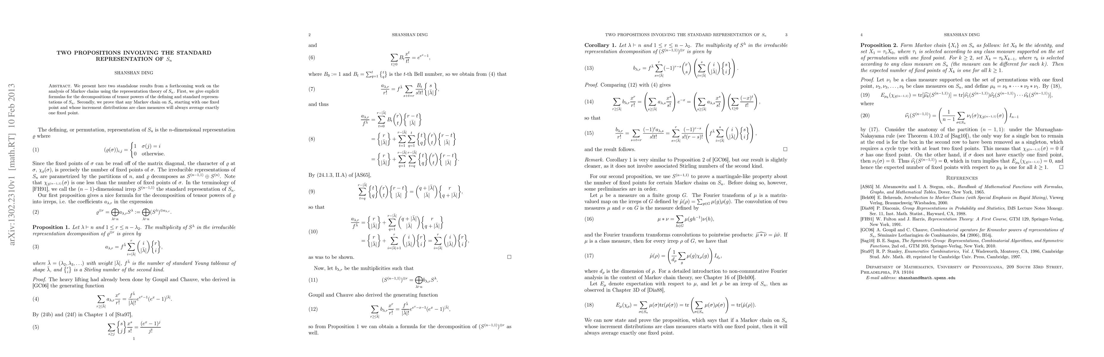 We present here two standalone results from a forthcoming work on the analysis of Markov chains using the representation theory of $S_n$. First, we give explicit formulas for the decompositions of tensor powers of the defining and standard representations of $S_n$. Secondly, we prove that any Markov chain on $S_n$ starting with one fixed point and whose increment distributions are class measures will always average exactly one fixed point.