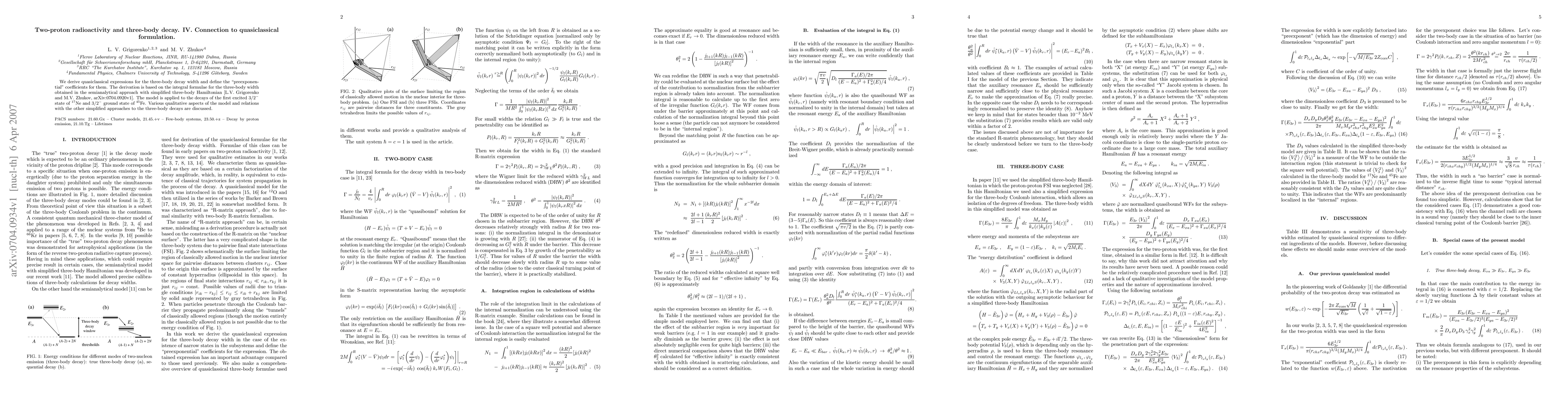 We derive quasiclassical expressions for the three-body decay width and define the ``preexponential'' coefficients for them. The derivation is based on the integral formulae for the three-body width obtained in the semianalytical approach with simplified three-body Hamiltonian [L.V. Grigorenko and M.V.\ Zhukov, arXiv:0704.0920v1]. The model is applied to the decays of the first excited $3/2^{-}$ state of $^{17}$Ne and $3/2^{-}$ ground state of $^{45}$Fe. Various qualitative aspects of the model and relations with the other simplified approaches to the three-body decays are discussed.