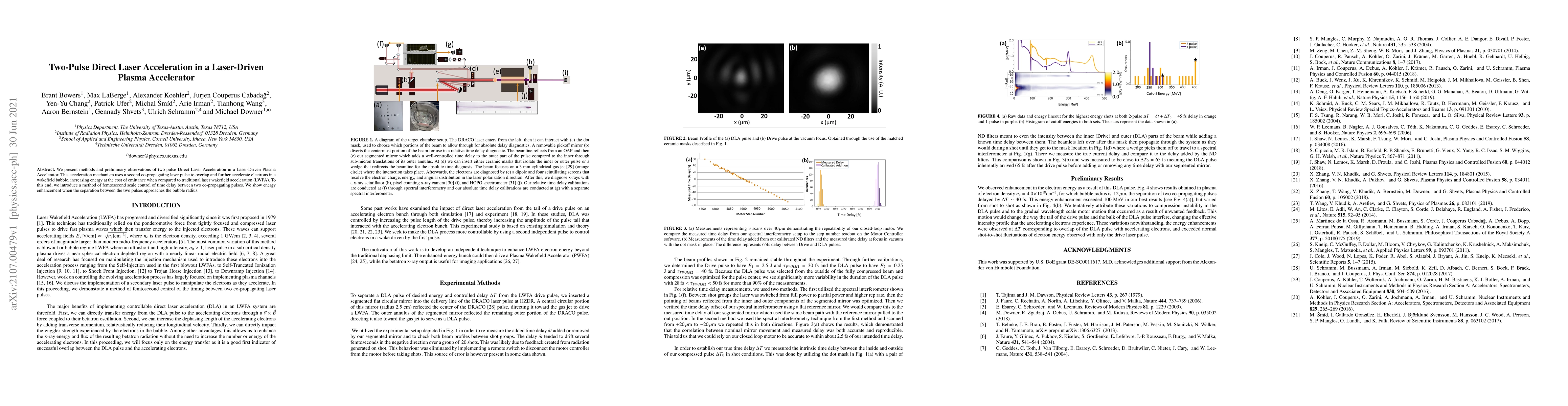 We present methods and preliminary observations of two pulse Direct Laser Acceleration in a Laser-Driven Plasma Accelerator. This acceleration mechanism uses a second co-propagating laser pulse to overlap and further accelerate electrons in a wakefield bubble, increasing energy at the cost of emittance when compared to traditional laser wakefield acceleration (LWFA). To this end, we introduce a method of femtosecond scale control of time delay between two co-propagating pulses. We show energy enhancement when the separation between the two pulses approaches the bubble radius.