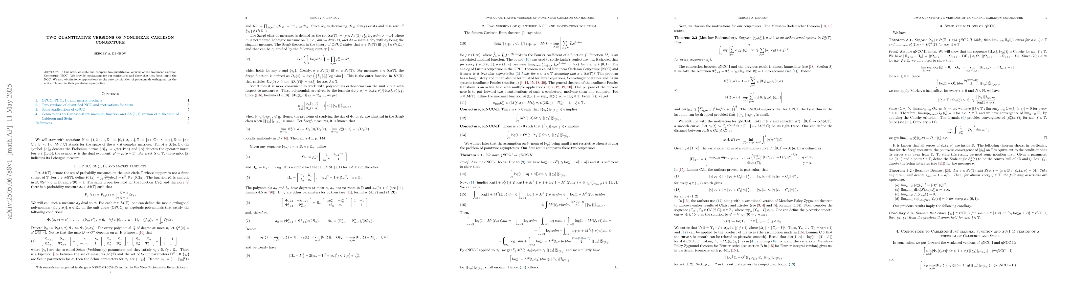 The paper compares two quantitative versions of the Nonlinear Carleson Conjecture, providing motivations and showing implications for the conjecture, while connecting to Carleson-Hunt maximal functions and presenting an SU(1,1) version of Calderon's theorem.