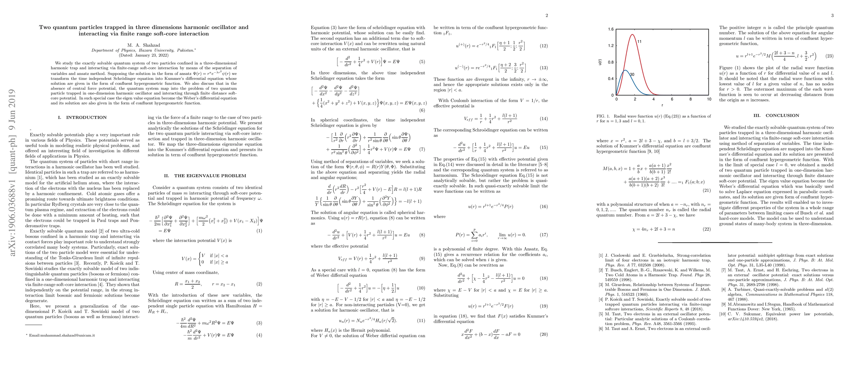 We study the exactly solvable quantum system of two particles confined in a three-dimensional harmonic trap and interacting via finite-range soft-core interaction by means of the separation of variables and ansatz method. Supposing the solution in the form of ansatz $\Psi(r)=r^{a}e^{-\lambda r^2} \psi(r)$ we transform the time independent Schr\"{o}dinger equation into Kummer's differential equation whose solution are given in the form of confluent hypergeometric function. We also discuss that in the absence of central force potential, the quantum system map into the problem of two quantum particle trapped in one-dimension harmonic oscillator and interacting through finite distance soft-core potential. In such special case the eigen value equation become the Weber's differential equation and its solution are also given in the form of confluent hypergeometric function.