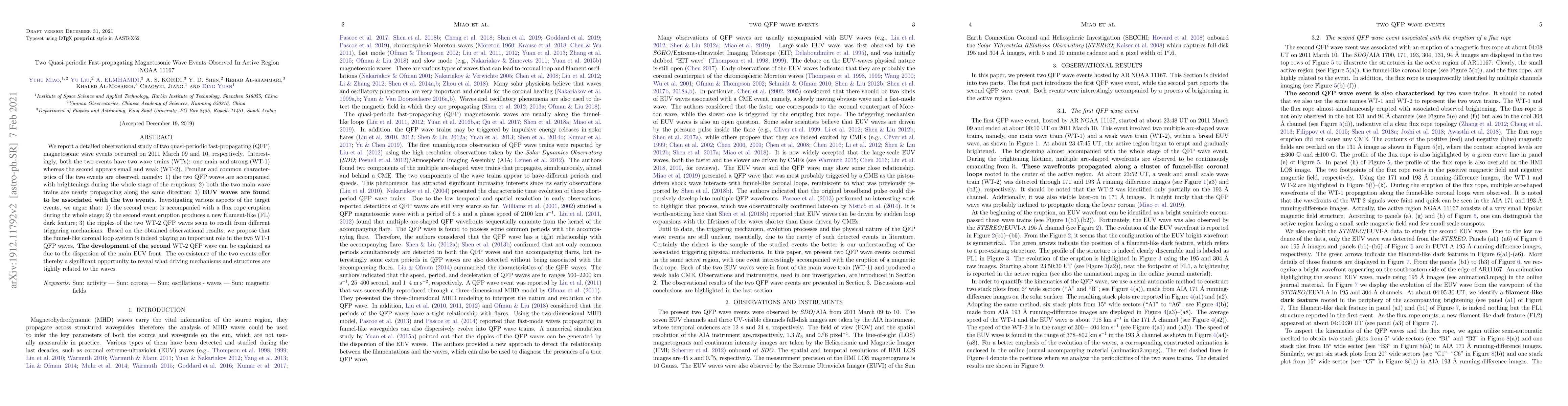 We report a detailed observational study of two quasi-periodic fast-propagating (QFP) magnetosonic wave events occurred on 2011 March 09 and 10, respectively. Interestingly, both the two events have two wave trains (WTs): one main and strong (WT-1) whereas the second appears small and weak (WT-2). Peculiar and common characteristics of the two events are observed, namely: 1) the two QFP waves are accompanied with brightenings during the whole stage of the eruptions; 2) both the two main wave trains are nearly propagating along the same direction; 3) EUV waves are found to be associated with the two events. Investigating various aspects of the target events, we argue that: 1) the second event is accompanied with a flux rope eruption during the whole stage; 2) the second event eruption produces a new filament-like (FL) dark feature; 3) the ripples of the two WT-2 QFP waves seem to result from different triggering mechanisms. Based on the obtained observational results, we propose that the funnel-like coronal loop system is indeed playing an important role in the two WT-1 QFP waves. The development of the second WT-2 QFP wave can be explained as due to the dispersion of the main EUV front. The co-existence of the two events offer thereby a significant opportunity to reveal what driving mechanisms and structures are tightly related to the waves.