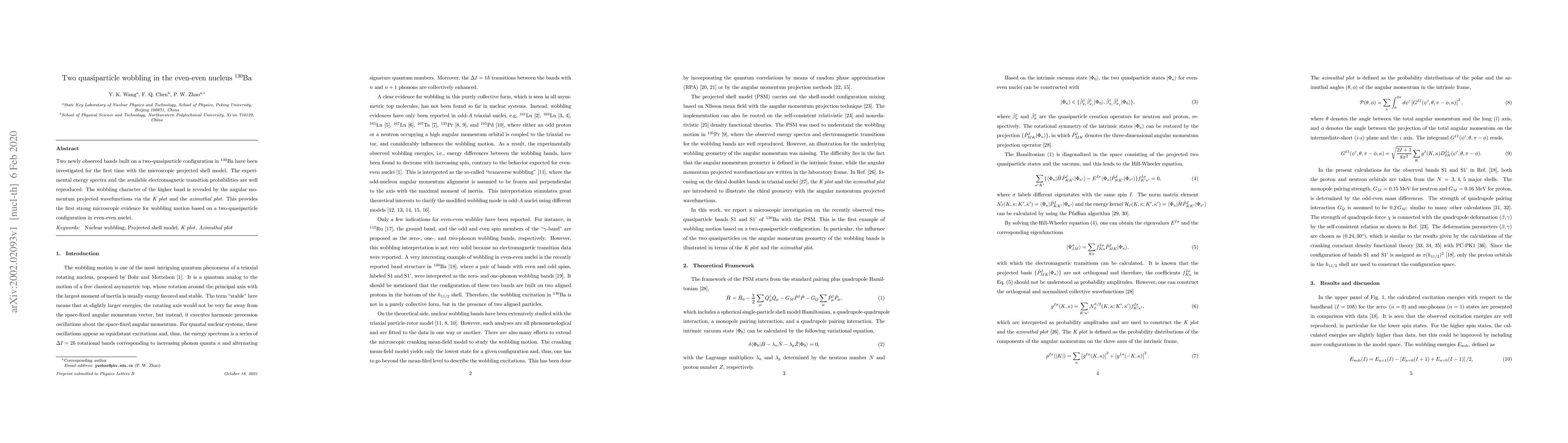 This paper investigates two newly observed bands in 130Ba, revealing wobbling motion through the microscopic projected shell model. The study provides the first strong microscopic evidence for wobbling based on a two-quasiparticle configuration in even-even nuclei.