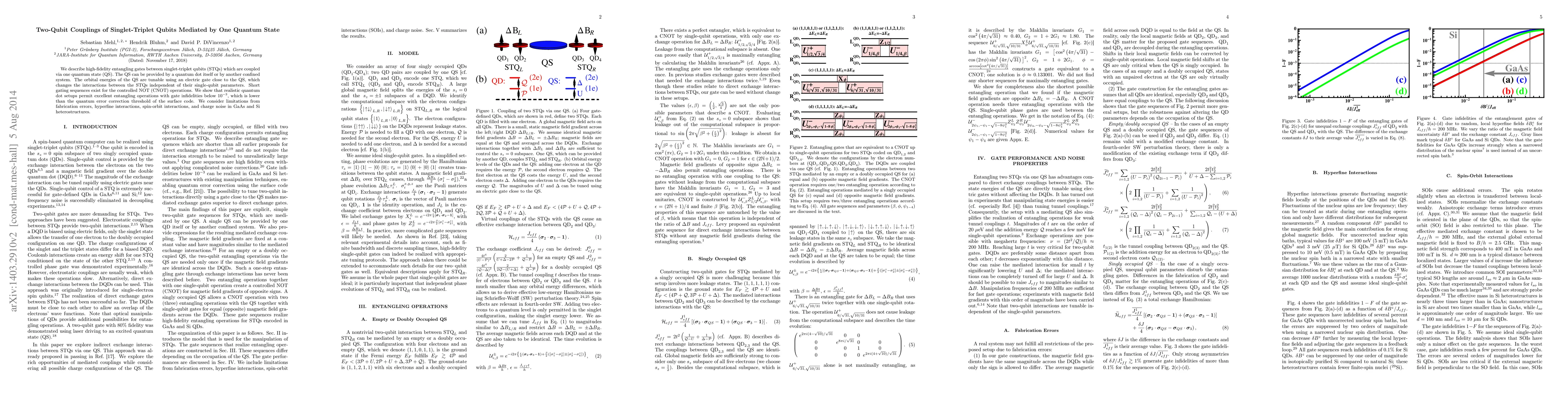 This paper details high-fidelity entangling gates for singlet-triplet qubits (STQs) mediated by a tunable quantum state, achieving gate infidelities below $10^{-3}$. It addresses limitations from fabrication and noise in GaAs and Si heterostructures.